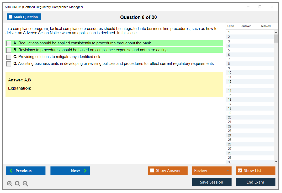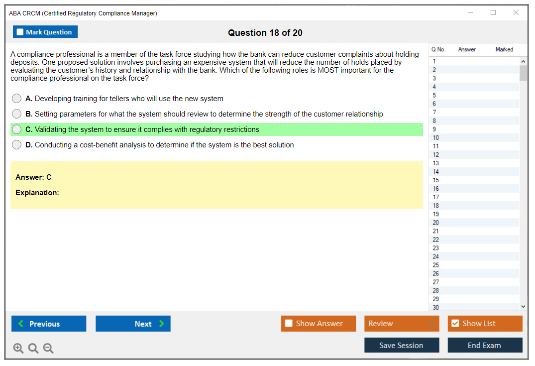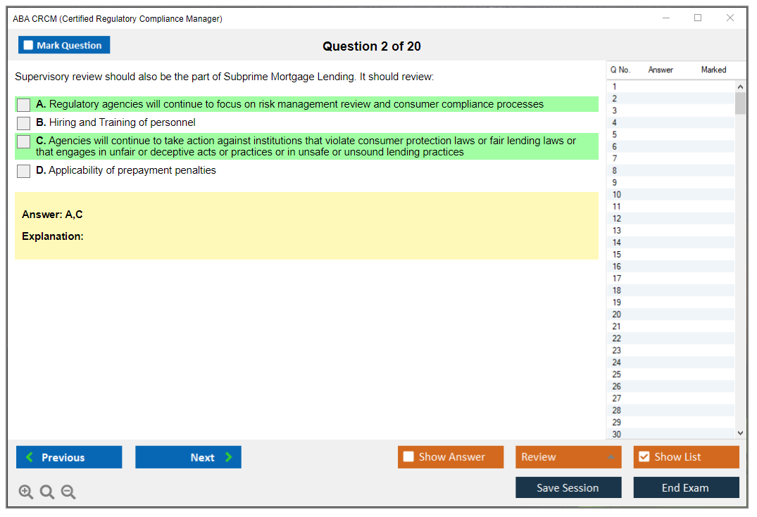 The ABA CRCM (Certified Regulatory Compliance Manager) Exam is a professional certification offered by the American Bankers Association (ABA) for individuals in the banking and financial services industry who specialize in regulatory compliance. It validates their expertise and knowledge in managing compliance risks and adhering to regulatory requirements.