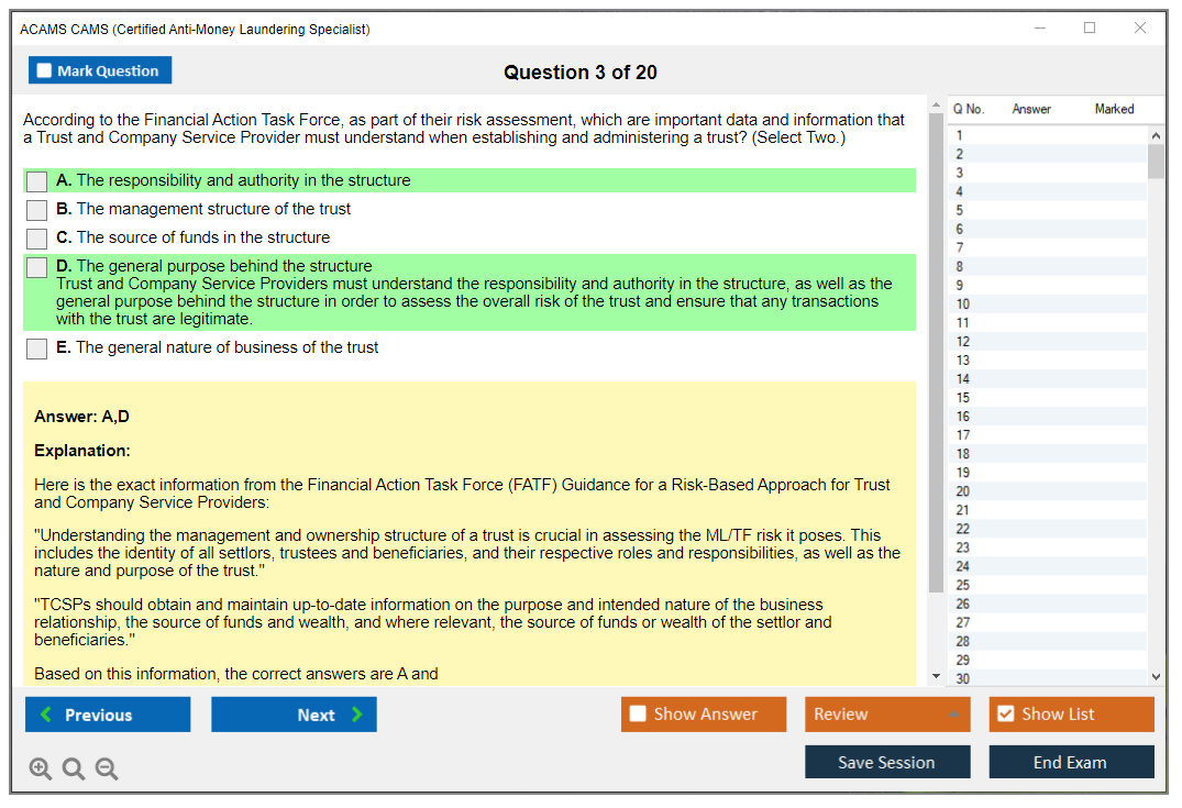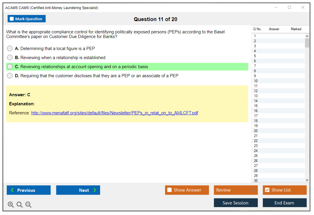 The ACAMS CAMS Exam is designed to assess the knowledge and skills of professionals in the field of anti-money laundering and financial crime prevention. It is a comprehensive test that covers various aspects of AML regulations, practices, and enforcement.