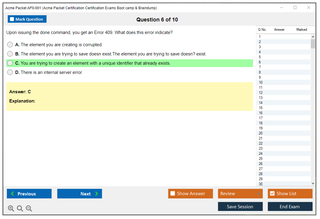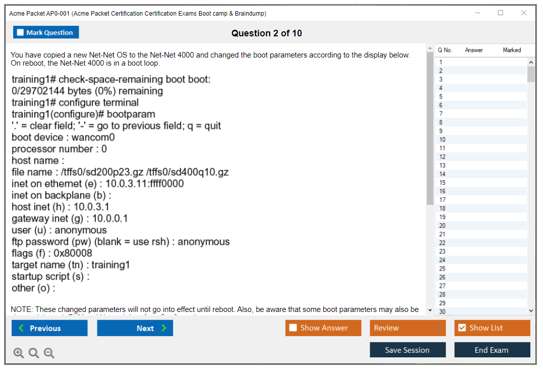The Acme Packet AP0-001 exam, also known as the Acme Packet Certification Boot camp & Braindump, is designed to test the knowledge and skills of professionals in deploying, configuring, and managing Acme Packet solutions.