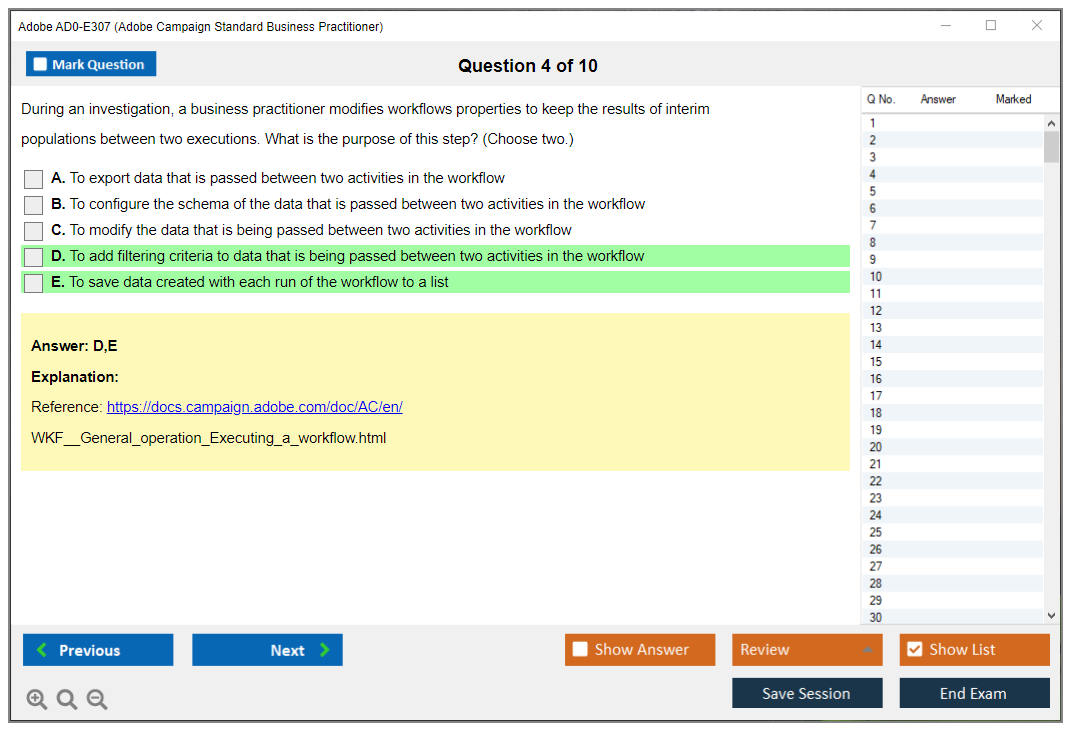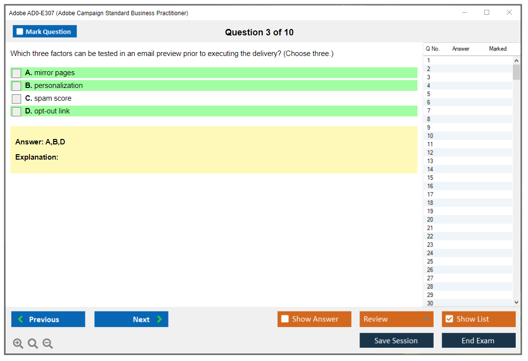 The Adobe AD0-E307 (Adobe Campaign Standard Business Practitioner) Exam is designed to test the knowledge and skills of individuals in managing and implementing Adobe Campaign Standard solutions. It covers various aspects of campaign management, including configuring, executing, and analyzing campaigns.