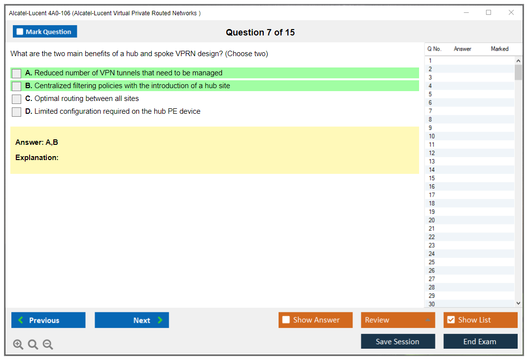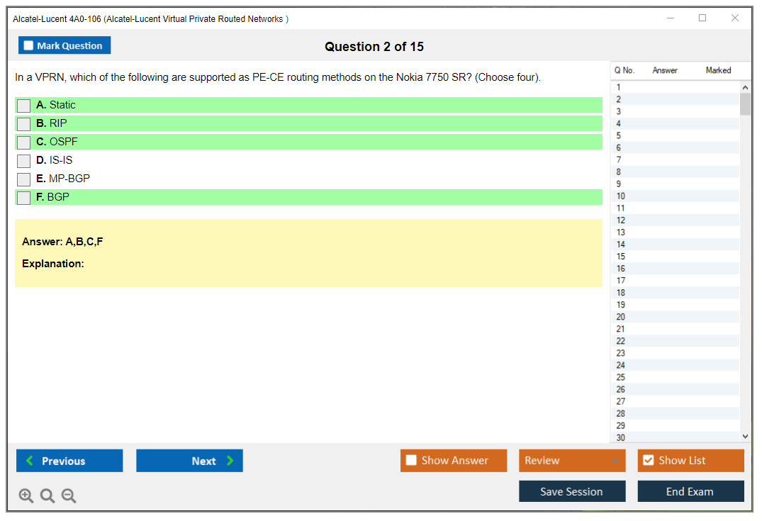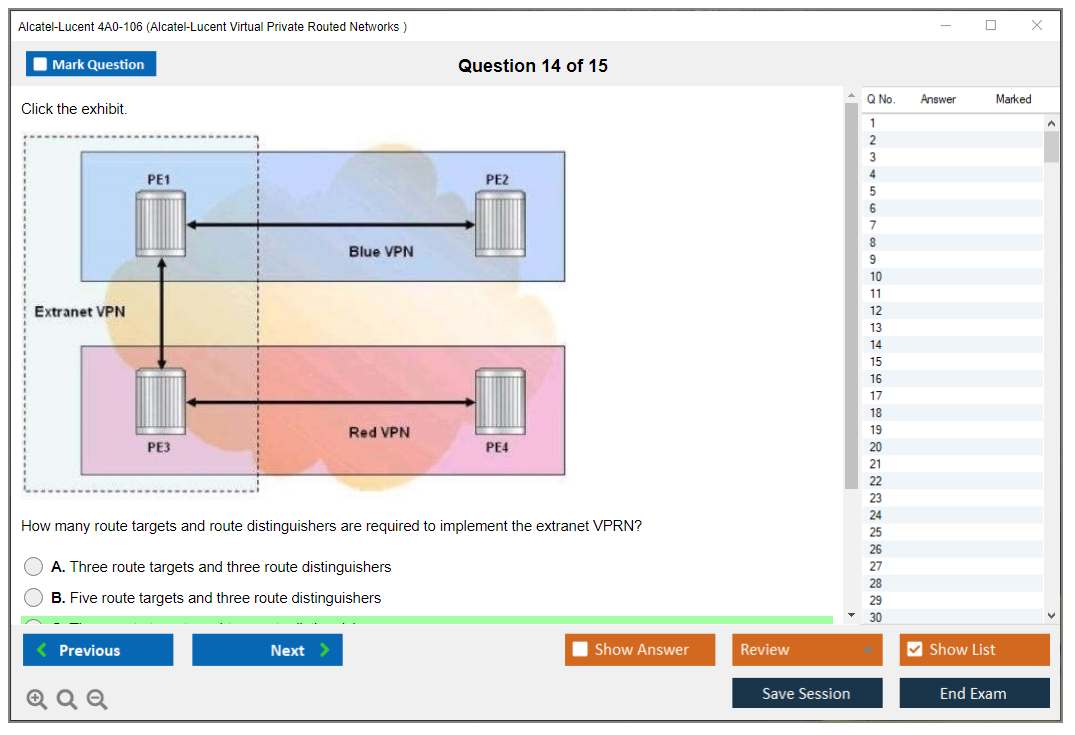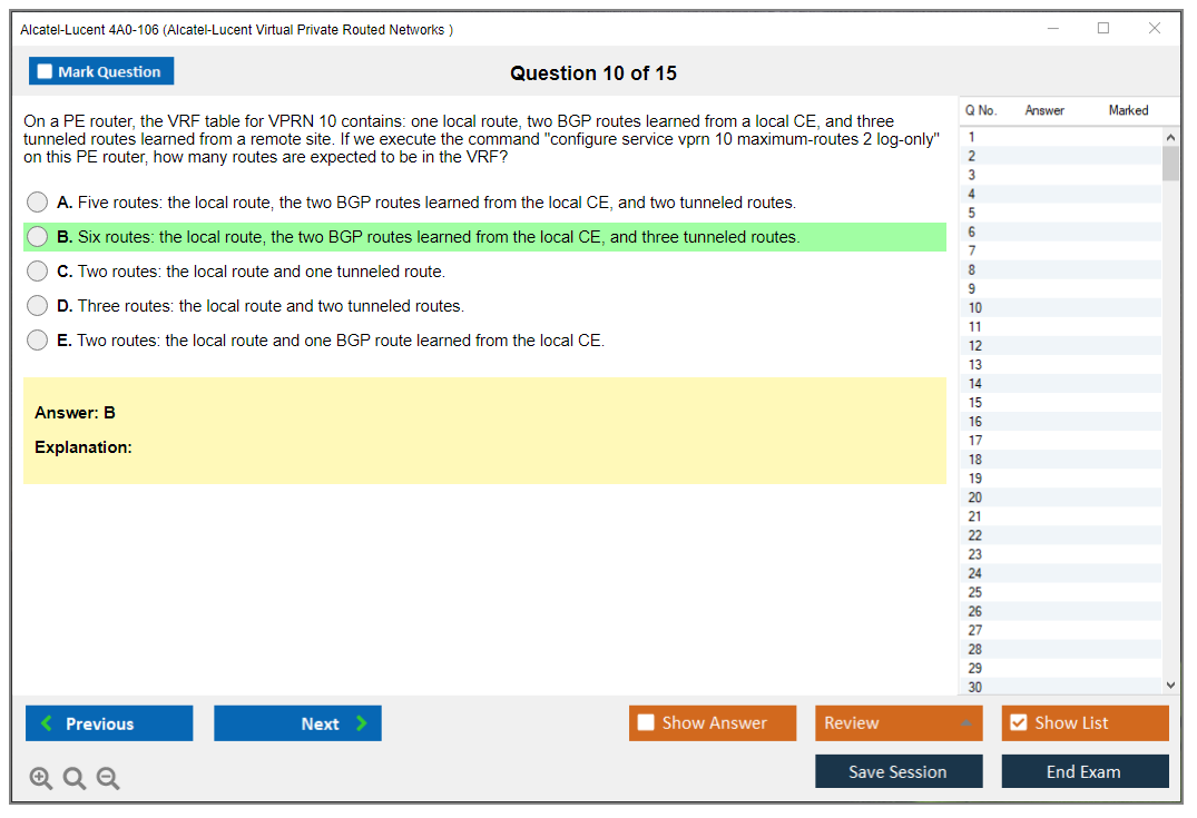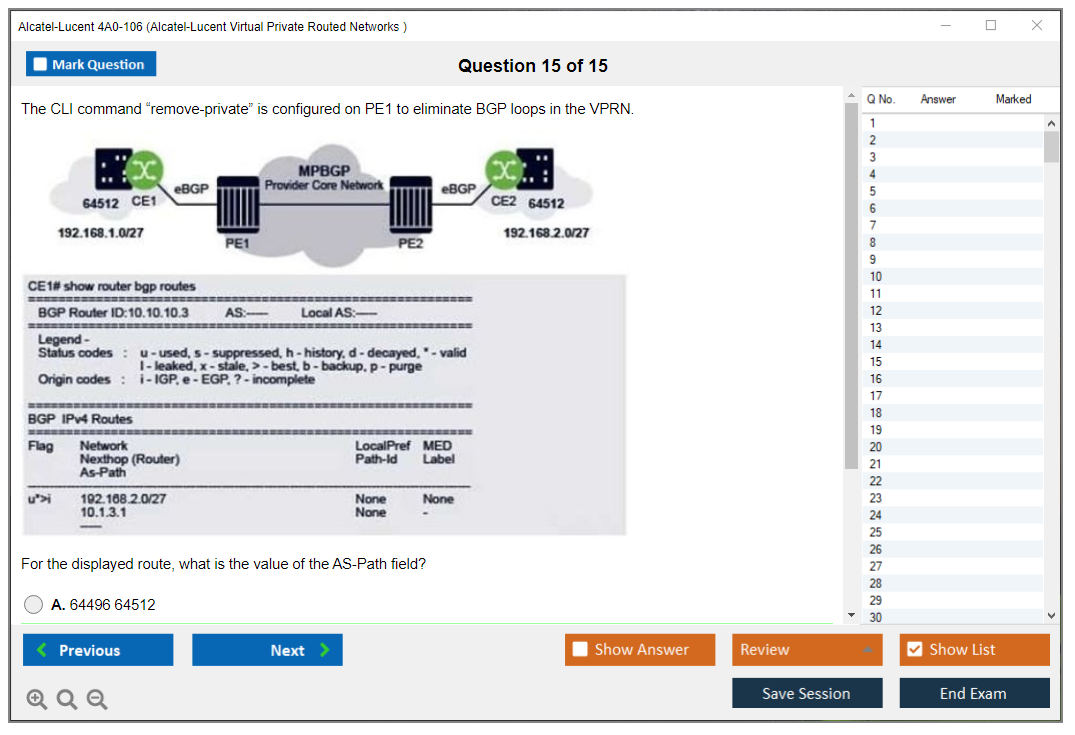 The Alcatel-Lucent 4A0-106 (Nokia Virtual Private Routed Networks) Exam is designed to test a candidate's knowledge and skills in configuring, managing, and troubleshooting Nokia's Virtual Private Routed Networks (VPRN). It is part of the Nokia Service Routing Certification (SRC) program.