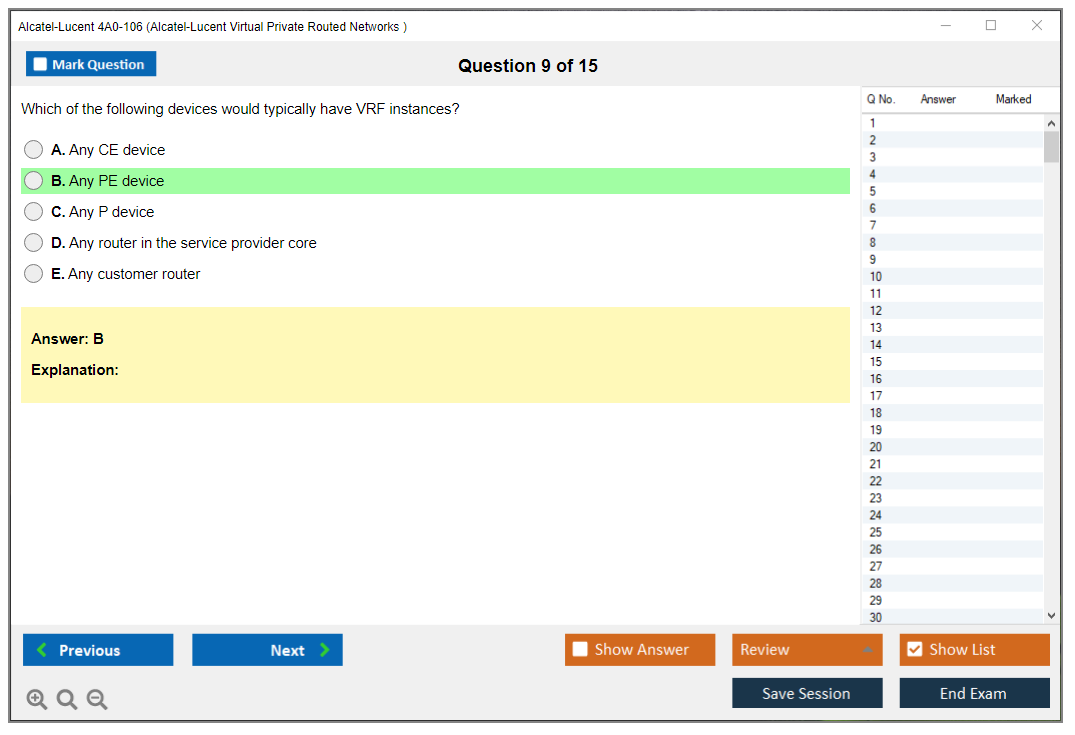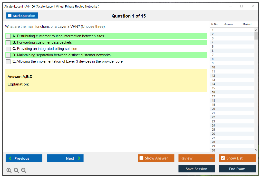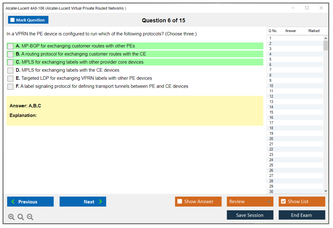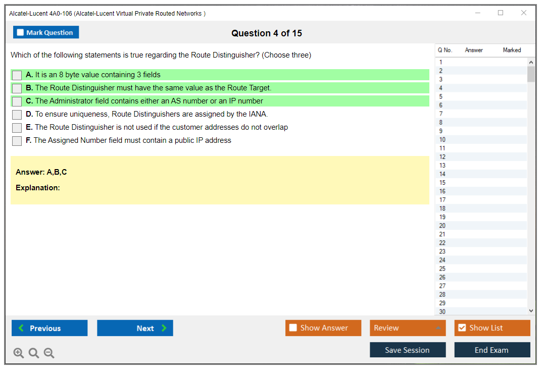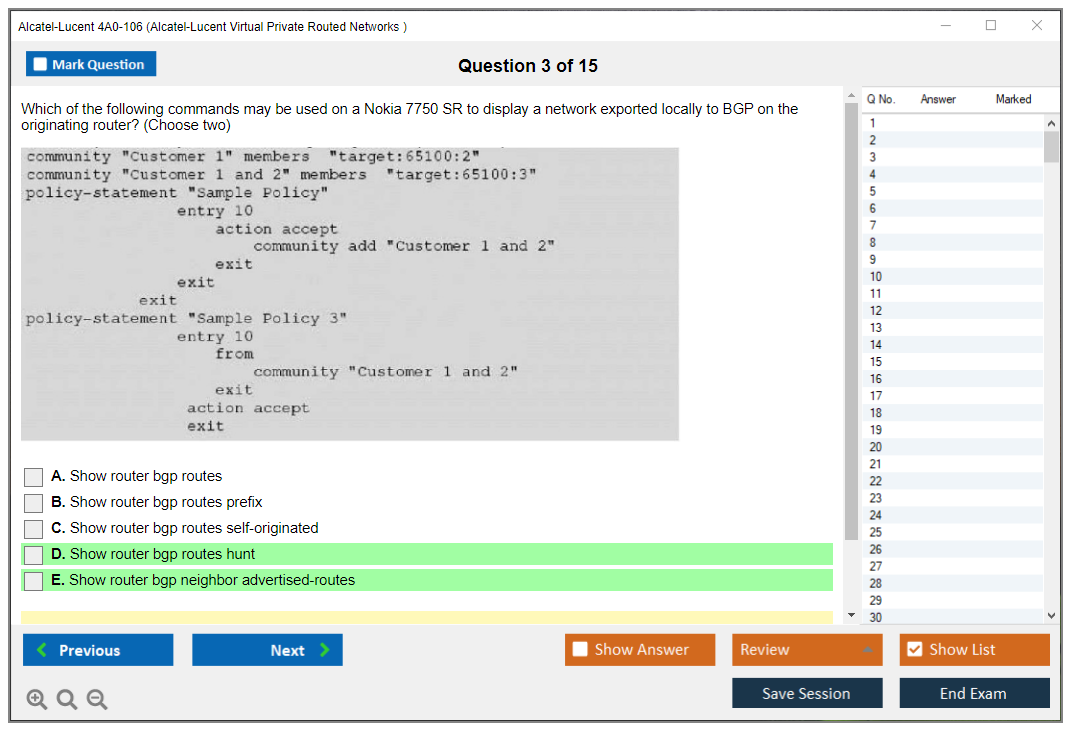 The Alcatel-Lucent 4A0-106 (Nokia Virtual Private Routed Networks) Exam is designed to test a candidate's knowledge and skills in configuring, managing, and troubleshooting Nokia's Virtual Private Routed Networks (VPRN). It is part of the Nokia Service Routing Certification (SRC) program.