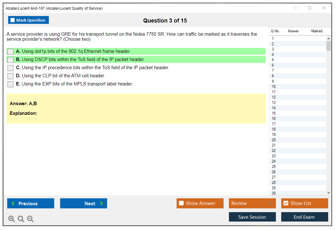 The Alcatel-Lucent 4A0-107 (Nokia Quality of Service) Exam is designed to test the knowledge and skills of candidates in implementing and managing quality of service (QoS) in Nokia networks. It is part of the Nokia Service Routing Certification (SRC) program.