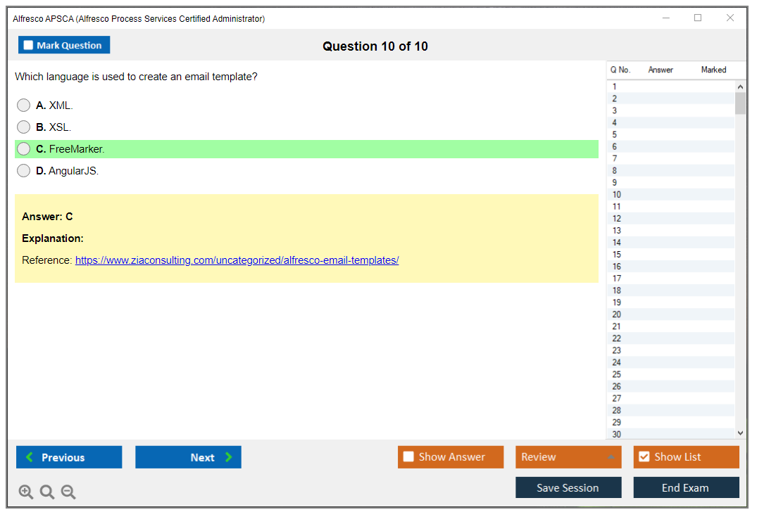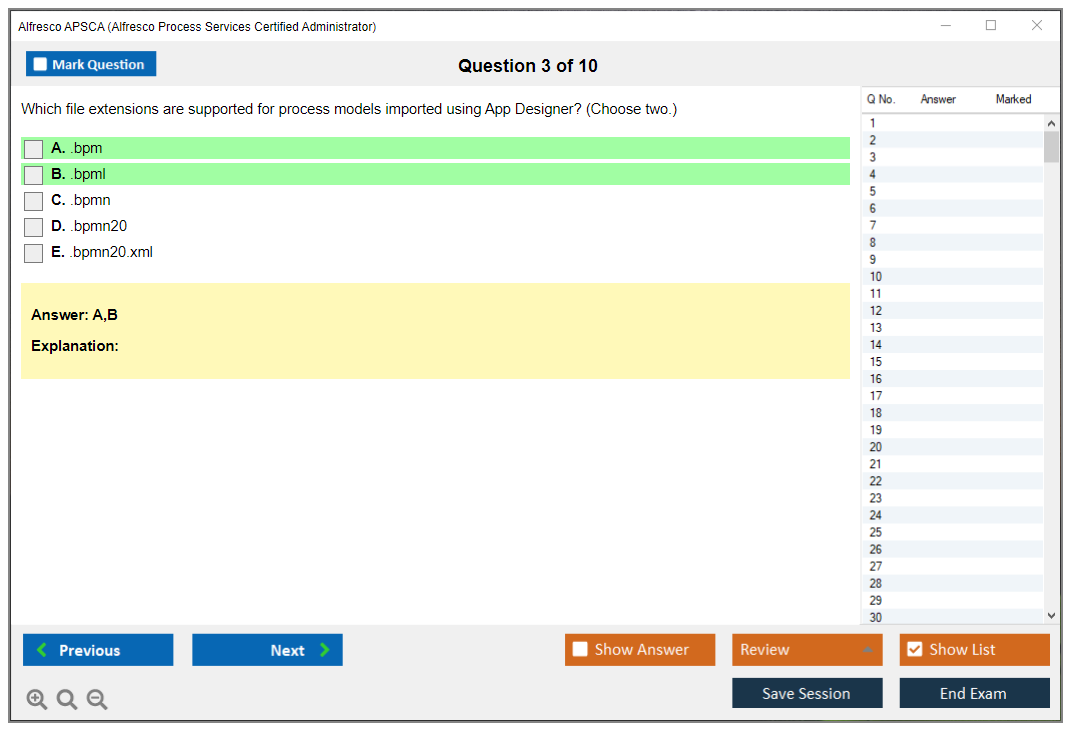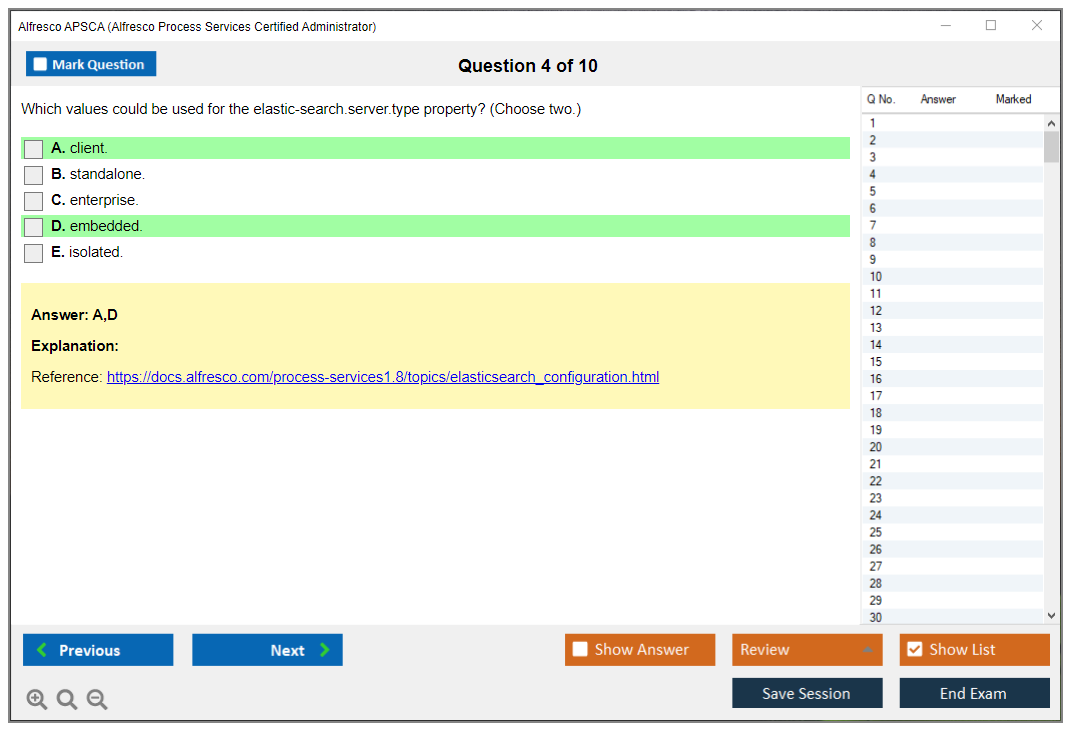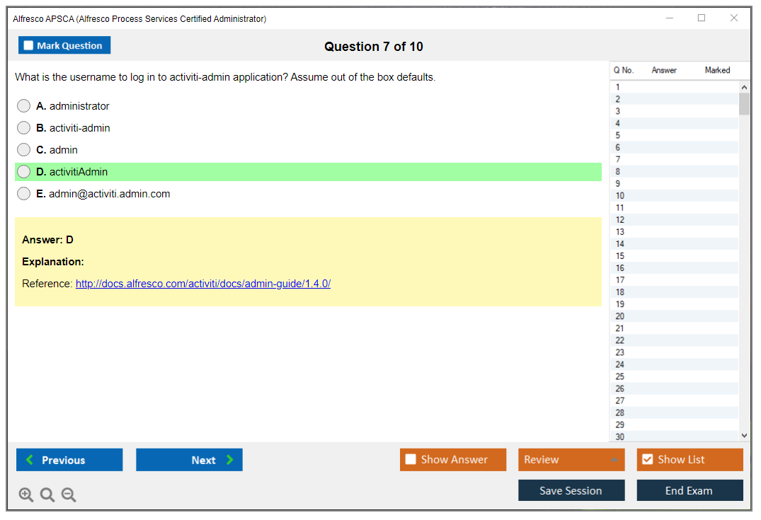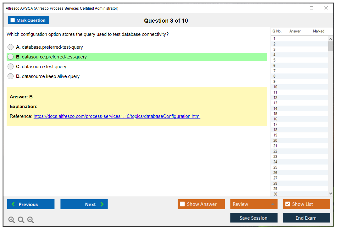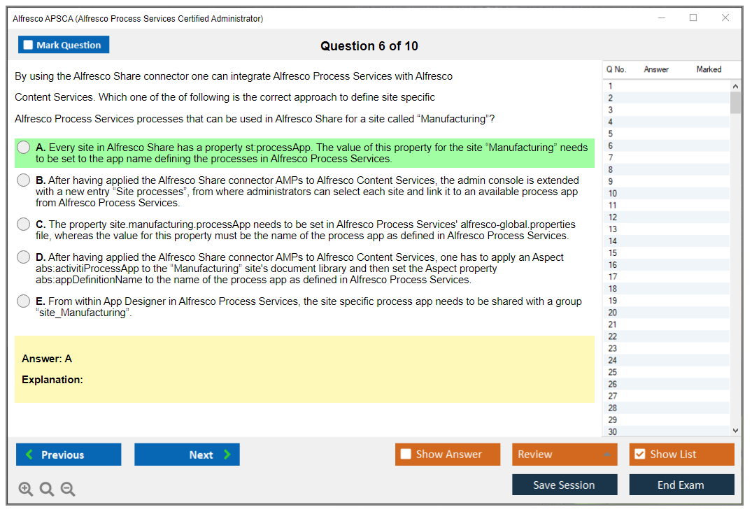 The Alfresco Process Services Certified Administrator (APSCA) exam is designed to validate the knowledge and skills of professionals responsible for administering Alfresco Process Services environments. It focuses on areas such as installation, configuration, management, and troubleshooting of Alfresco Process Services.