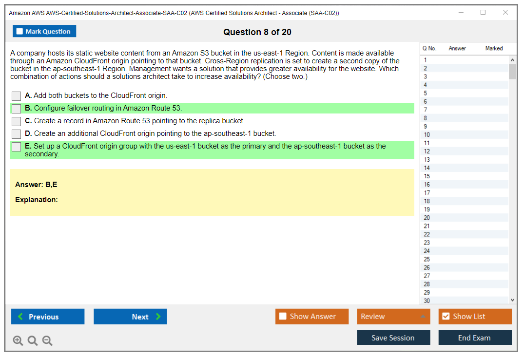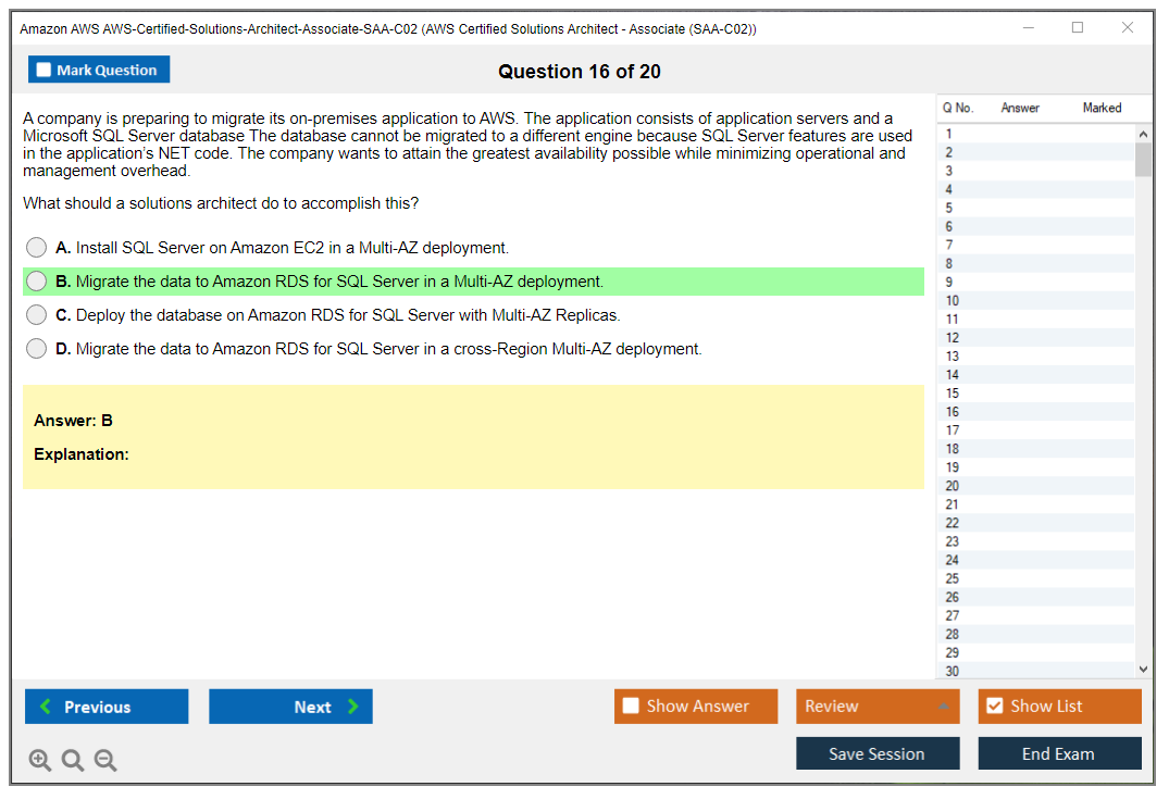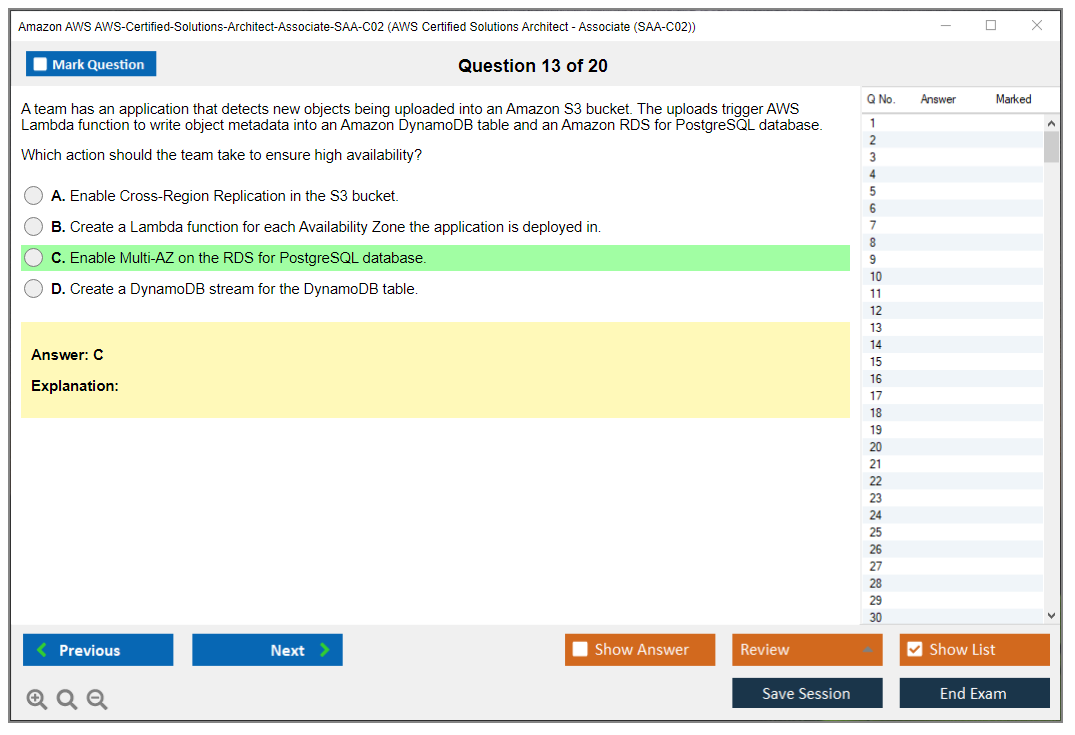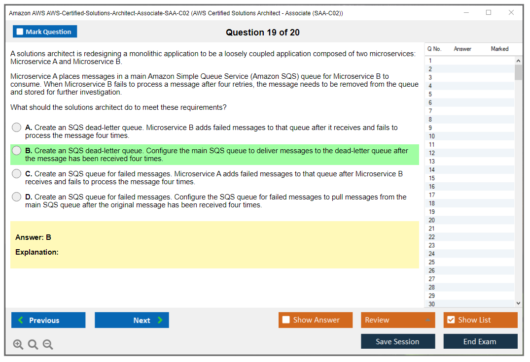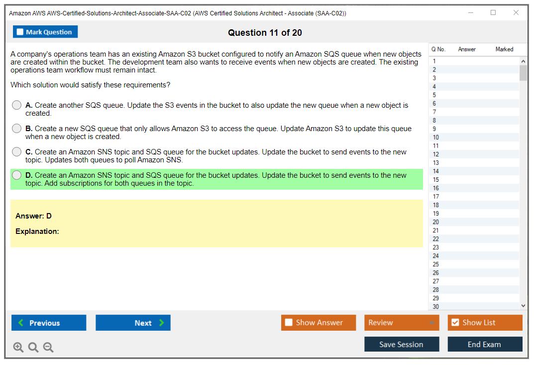 umpsBoss's practice tests for the AWS SAA-C02 practice test are fantastic for targeted studying. I loved the option to focus on specific domains or mix things up for a comprehensive review. The timer function added an extra layer of realism, helping me manage time effectively during the actual exam. DumpsBoss definitely helped me optimize my study time and ultimately pass the SAA-C02 with flying colors!