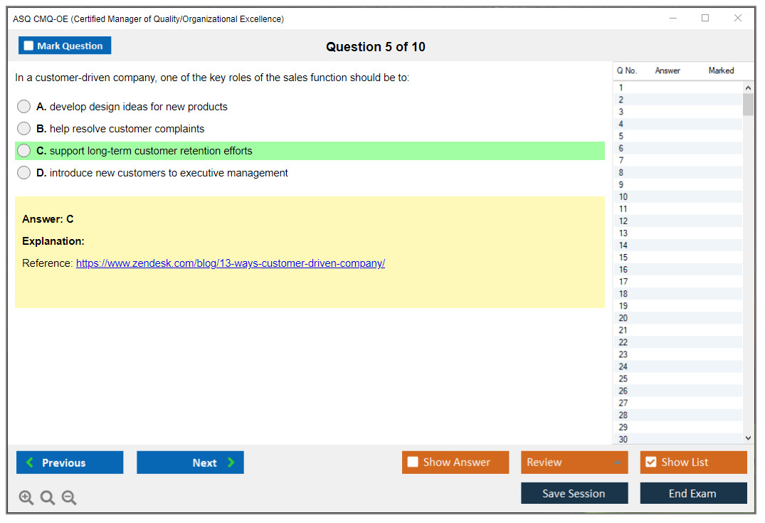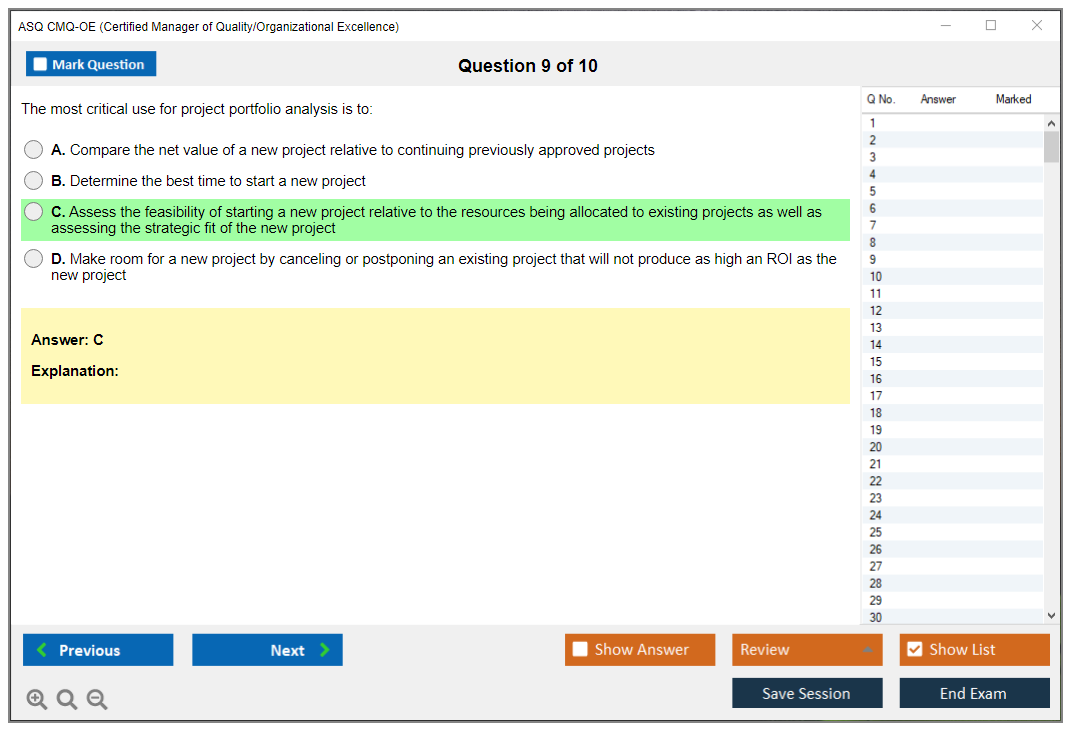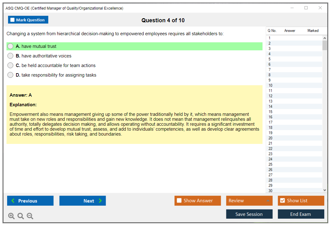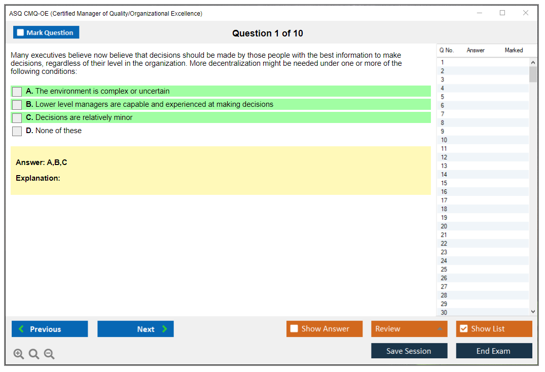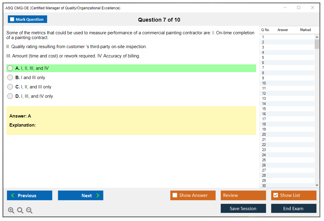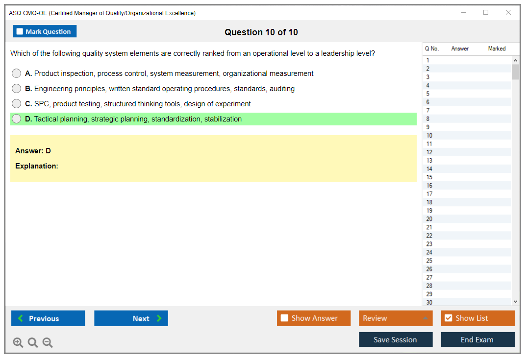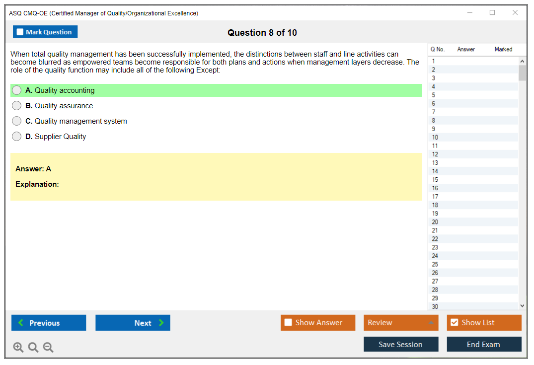 The ASQ CMQ-OE (Certified Manager of Quality/Organizational Excellence) exam is designed to assess the knowledge and skills of individuals in managing quality and organizational excellence. This certification is for professionals who lead and champion process improvement initiatives in organizations.