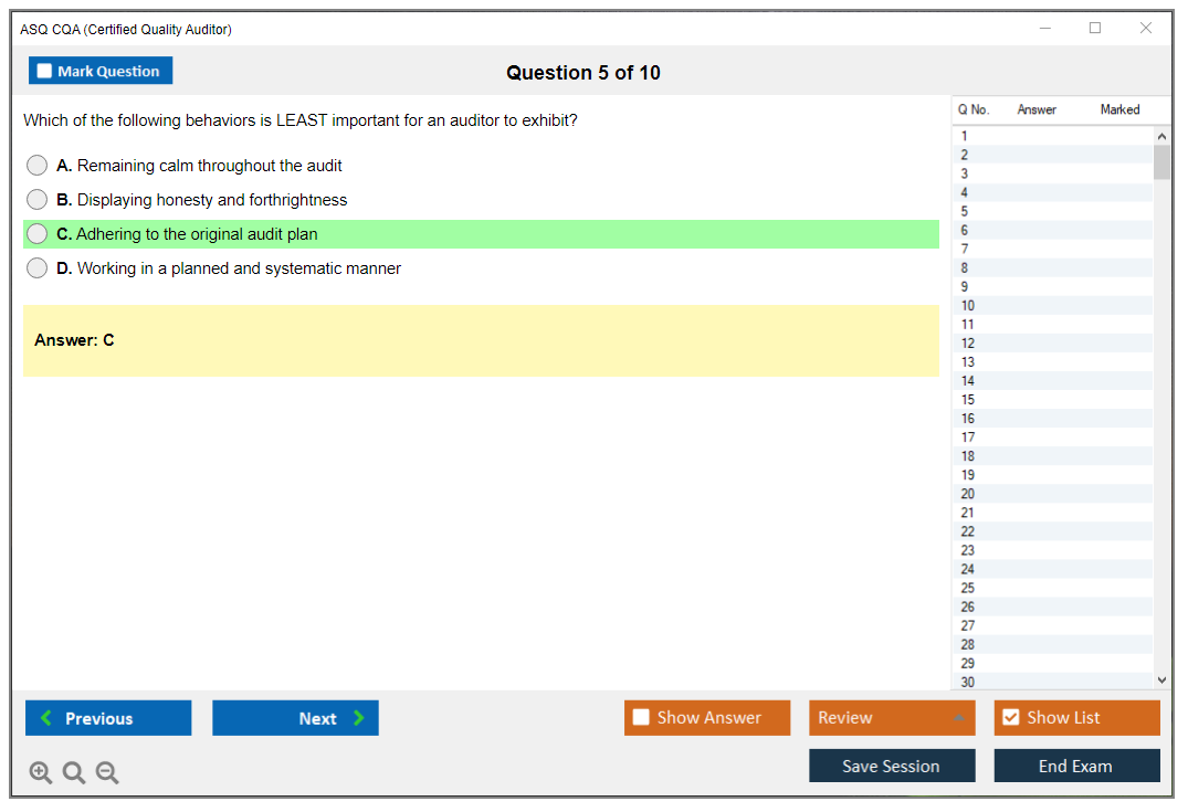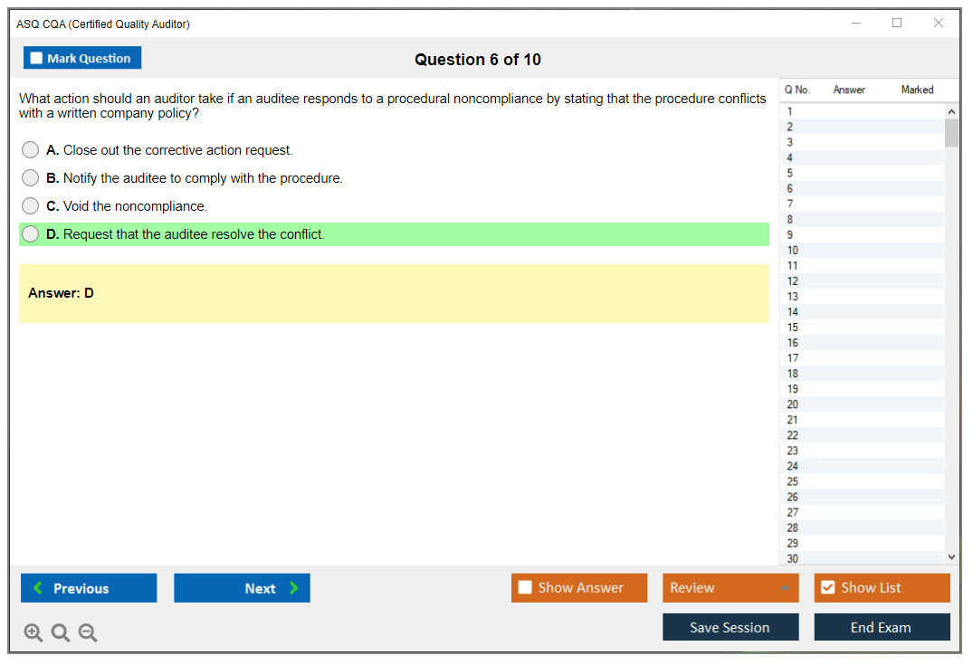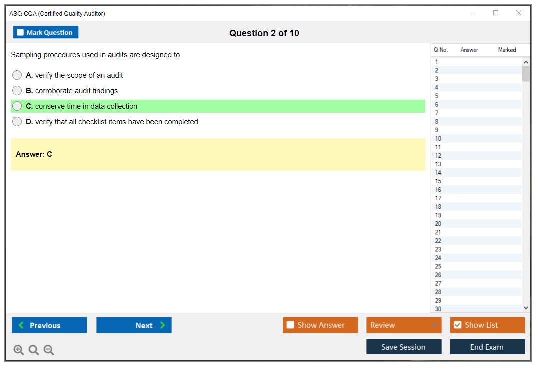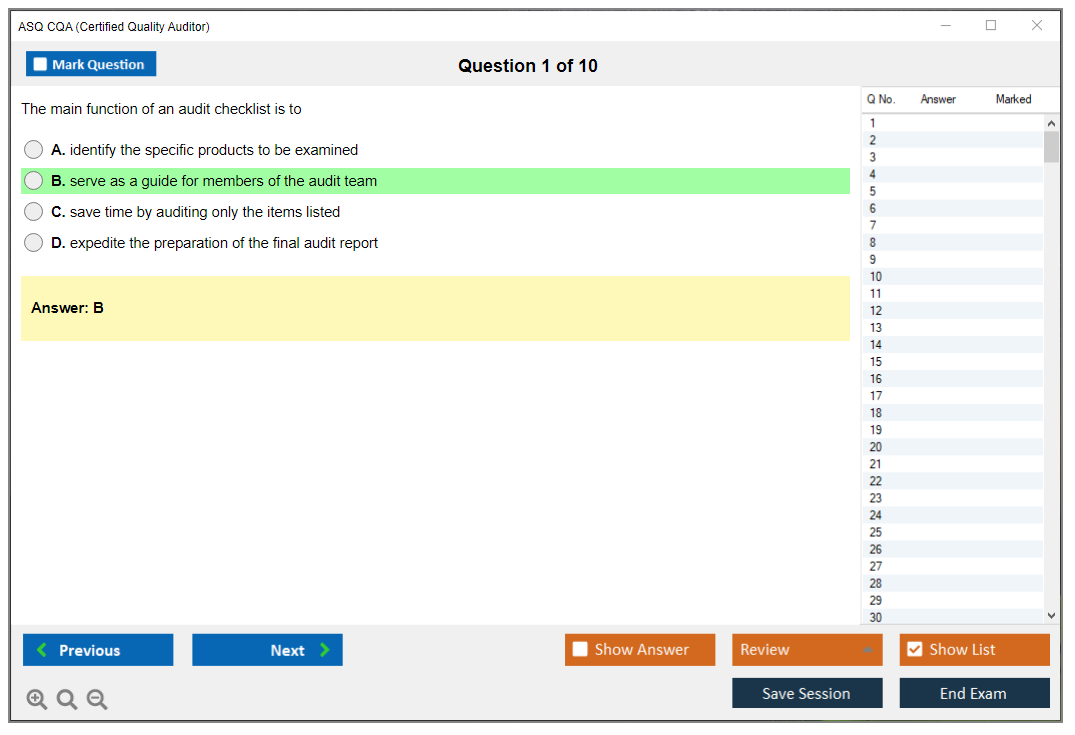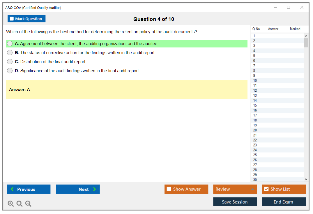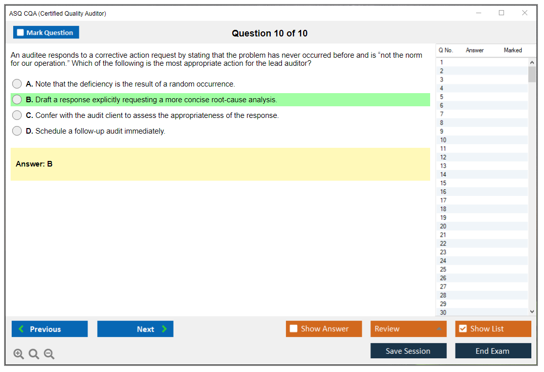 The ASQ Certified Quality Auditor (CQA) exam is a professional certification exam that evaluates an individual's understanding of the standards and principles of auditing, as well as the techniques of examining, questioning, evaluating, and reporting to determine a quality system's adequacy and deficiencies.