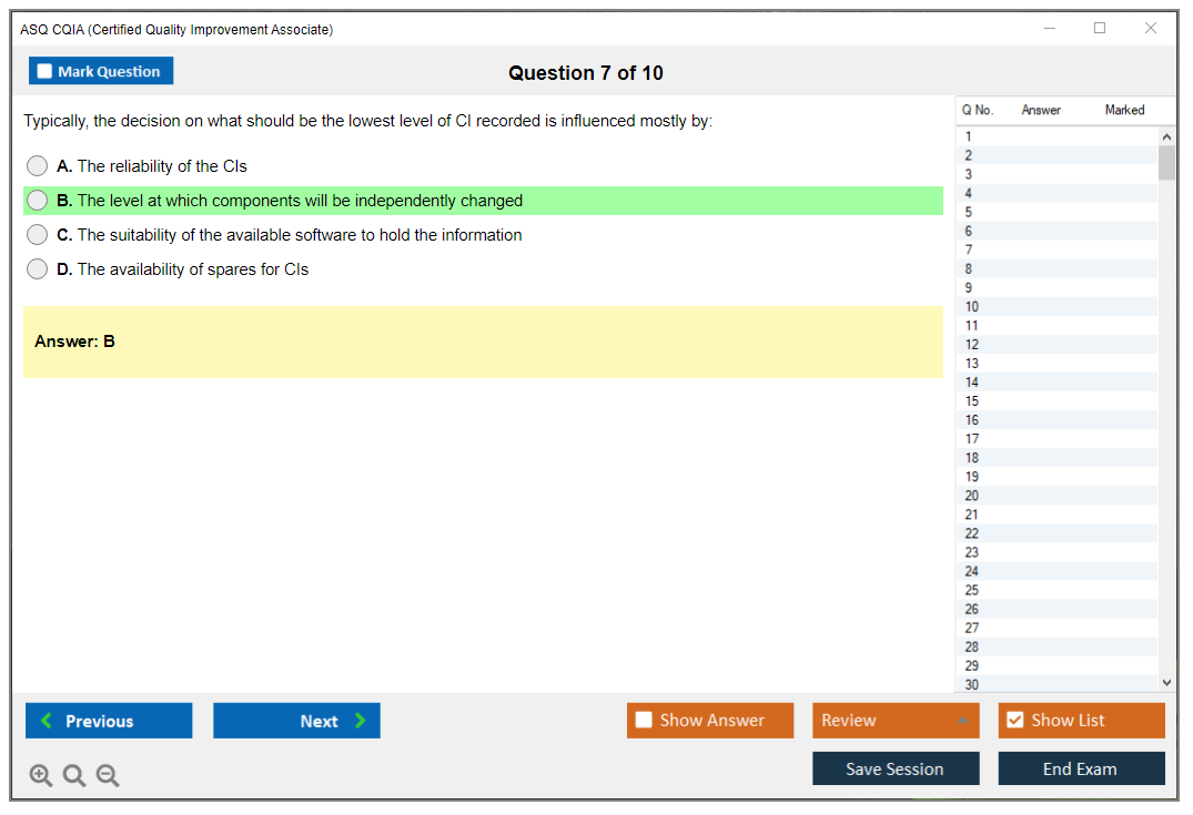The ASQ CQIA exam features multiple-choice questions that assess the candidate's knowledge and application of quality improvement principles.