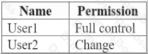When accessing Share1, which two actions can be performed by User1 but not by User2? Each correct answer presents part of the solution.