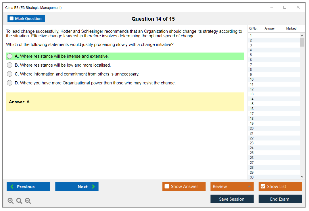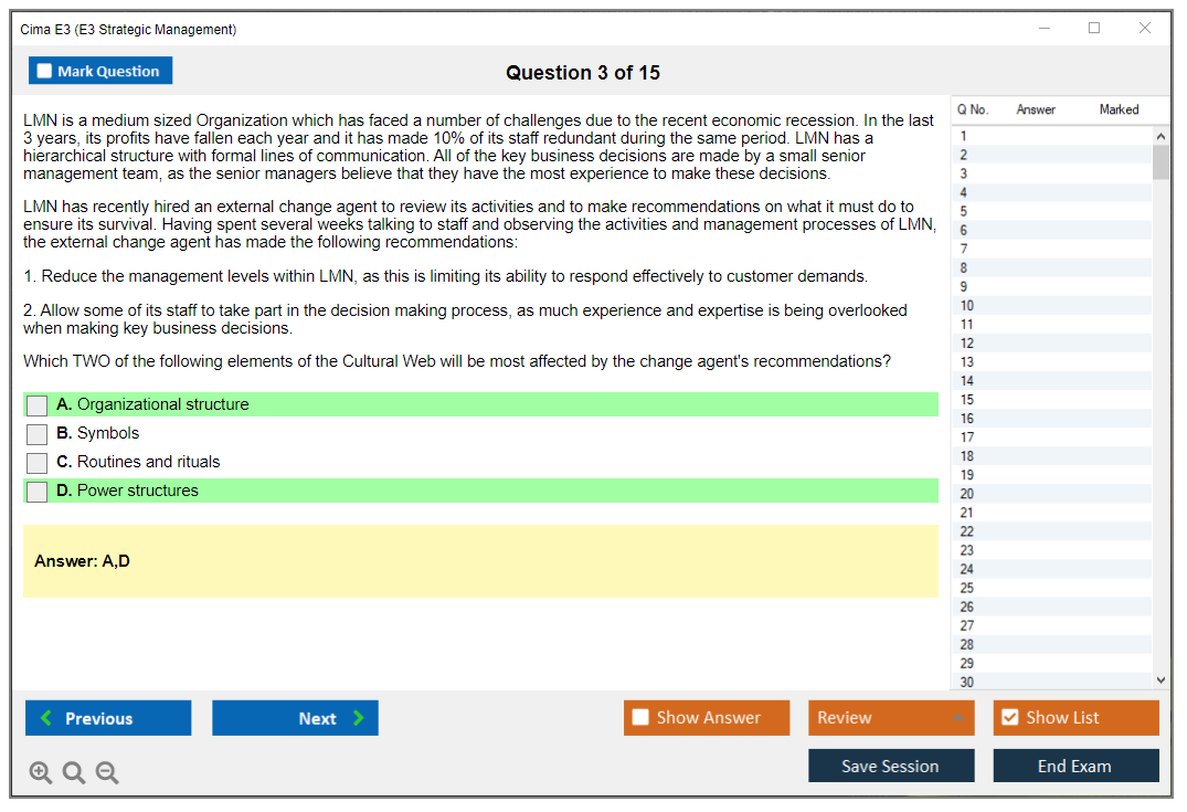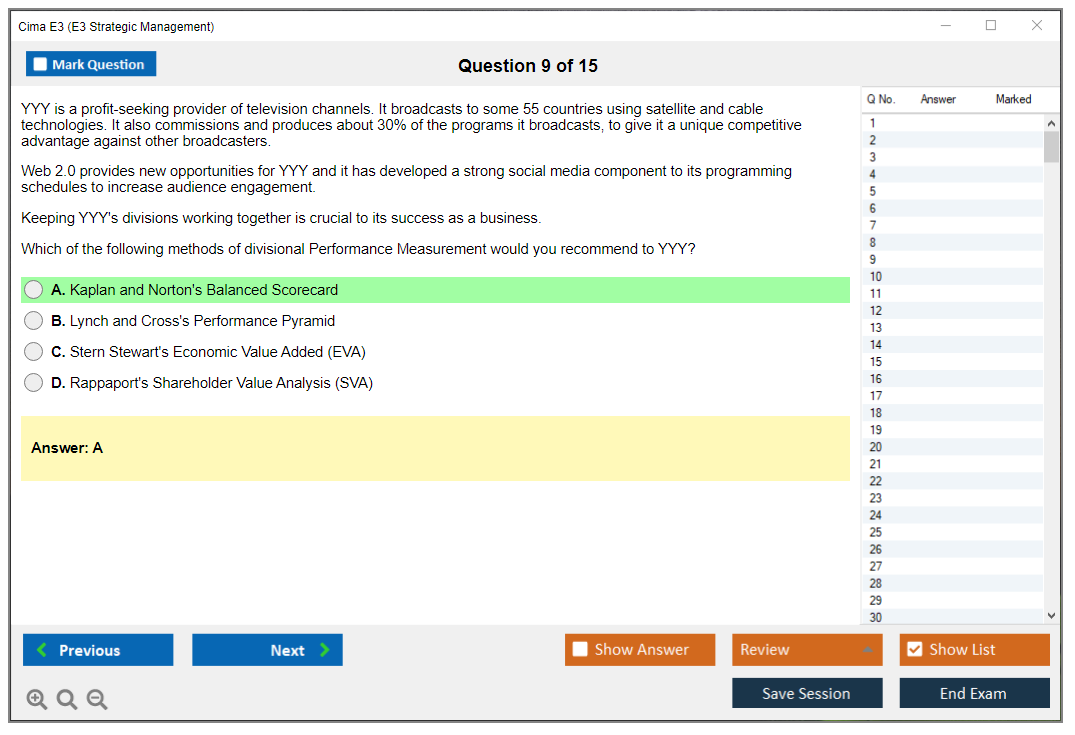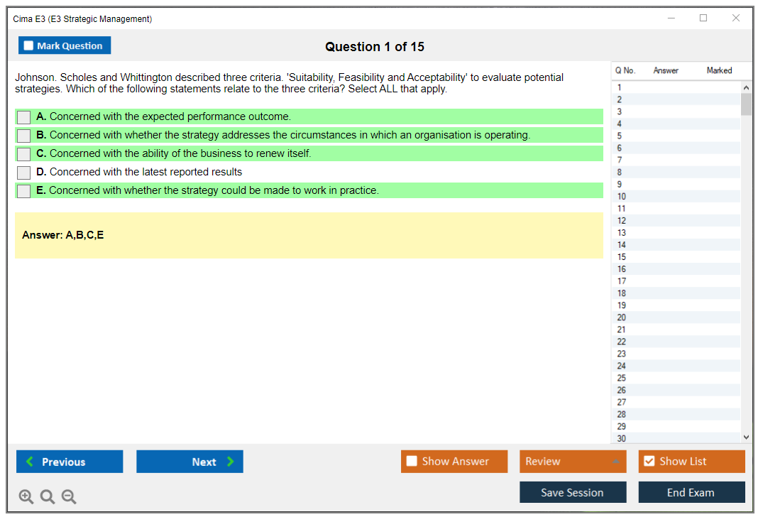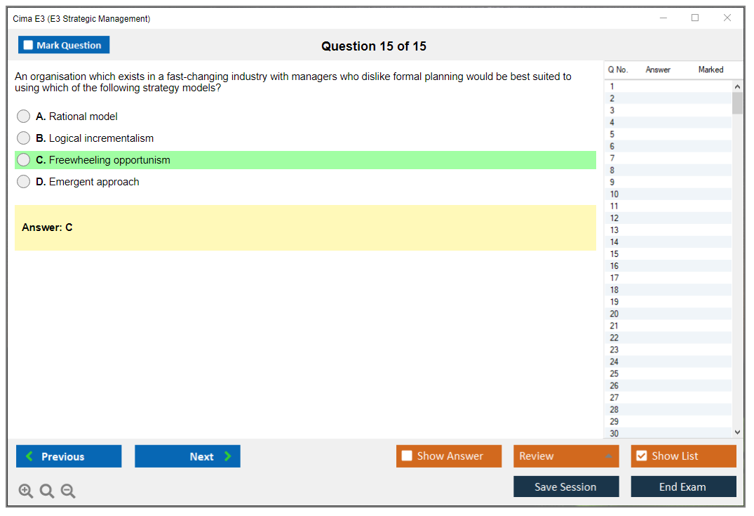 The CIMA E3 (Strategic Management) Exam is part of the Chartered Institute of Management Accountants (CIMA) professional qualification. It focuses on strategic management and leadership, preparing candidates to develop and implement successful business strategies.