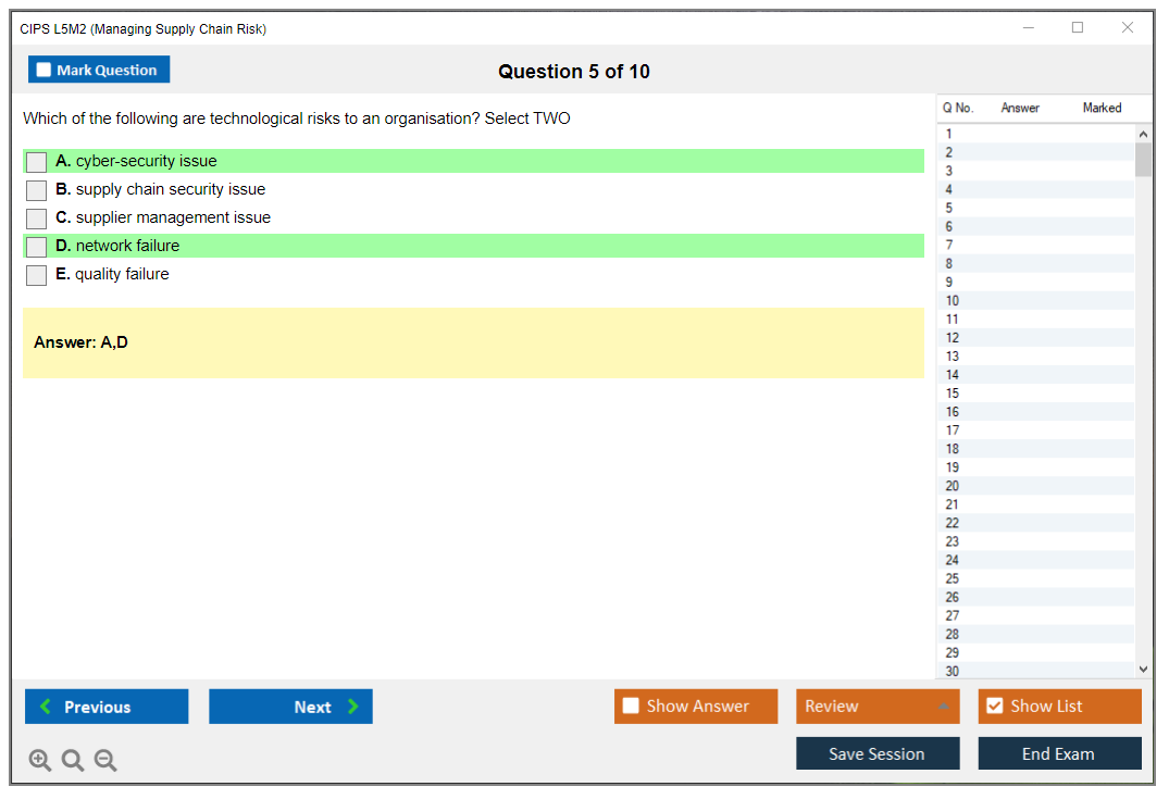 The CIPS L5M2 (Managing Supply Chain Risk) Exam is part of the Chartered Institute of Procurement & Supply (CIPS) Level 5 Advanced Diploma in Procurement and Supply. It focuses on identifying and managing risks within the supply chain to ensure continuity and efficiency.