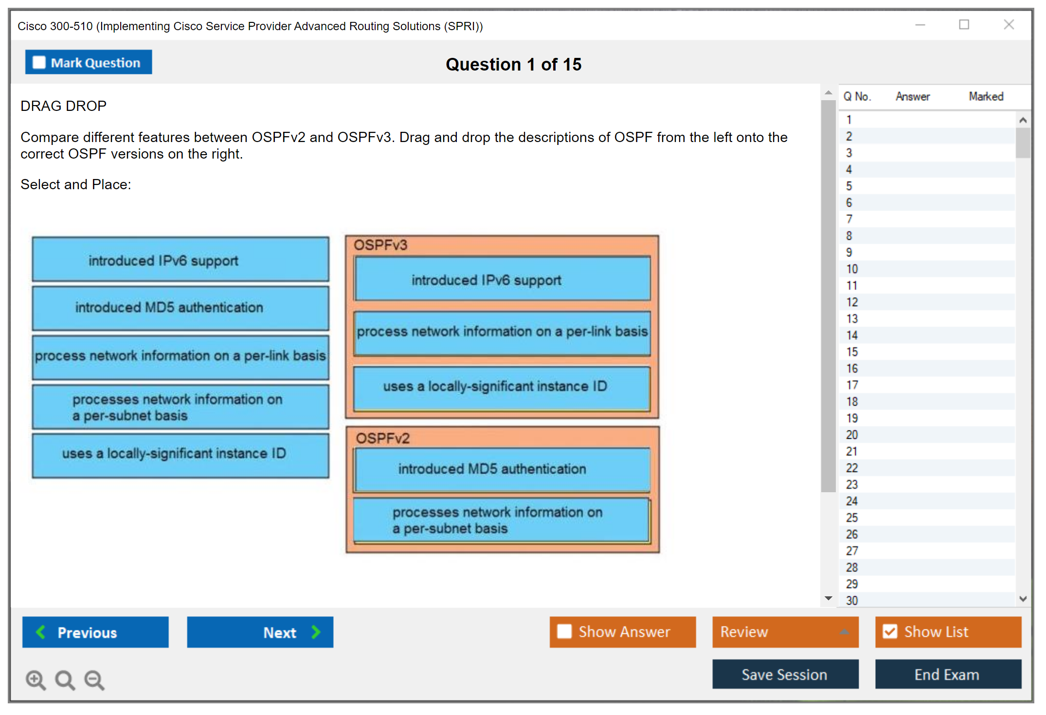 The question format of the Cisco 300-510 exam includes multiple-choice questions, drag-and-drop questions, and simulations.