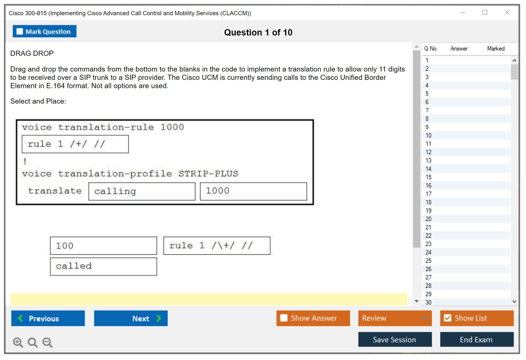 The question format of the Cisco 300-815 exam includes multiple-choice questions, drag-and-drop, simulations, and testlets.