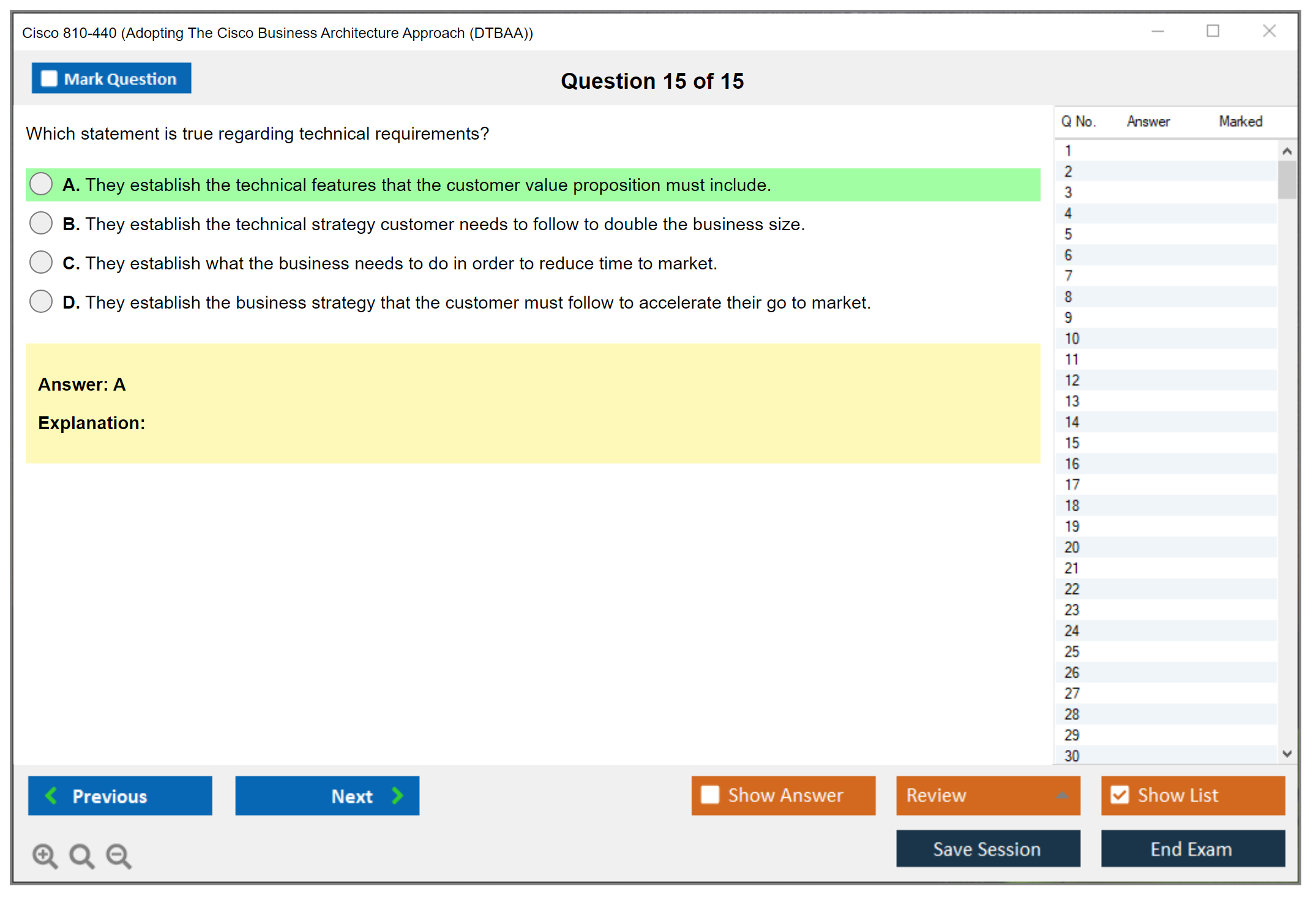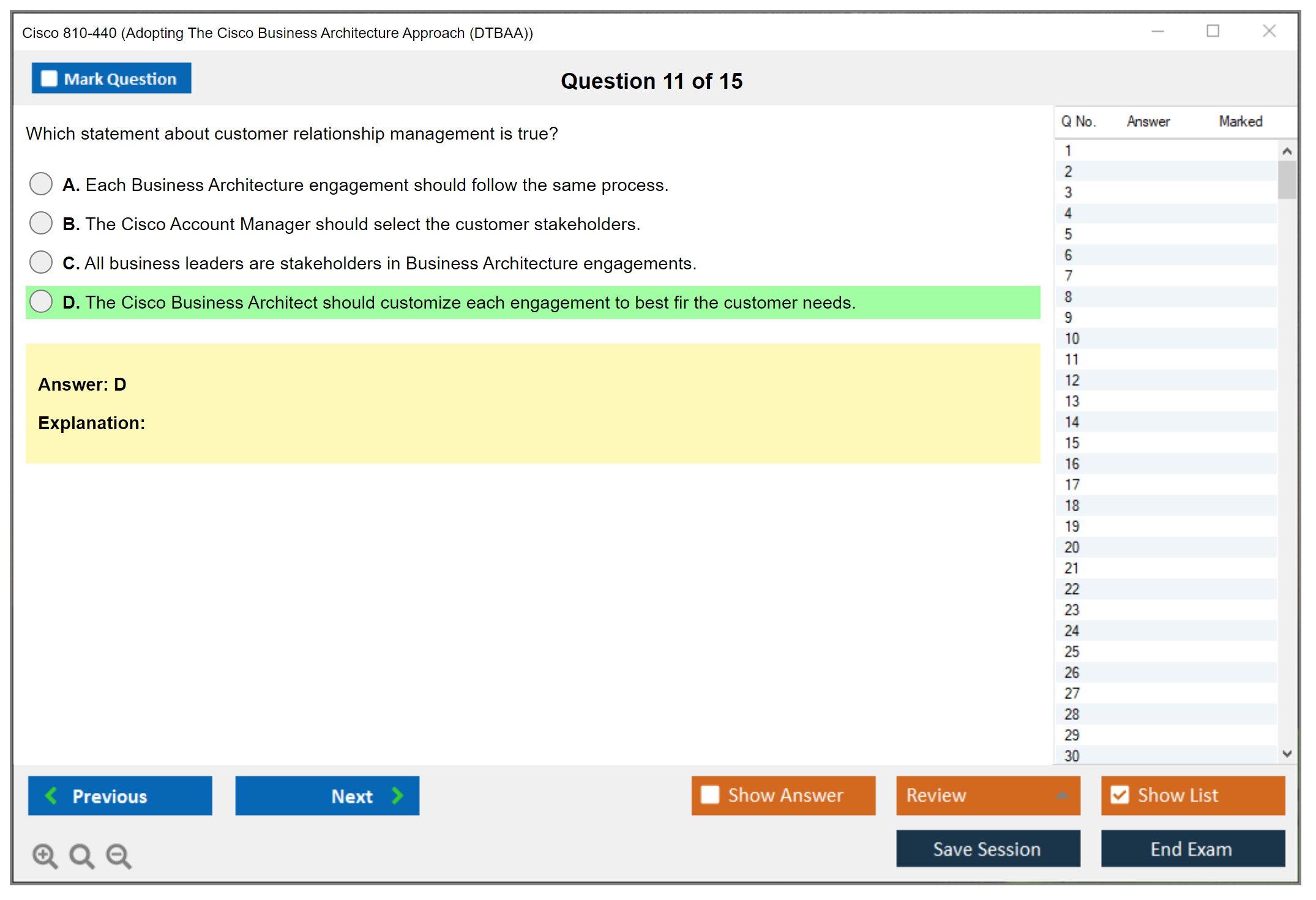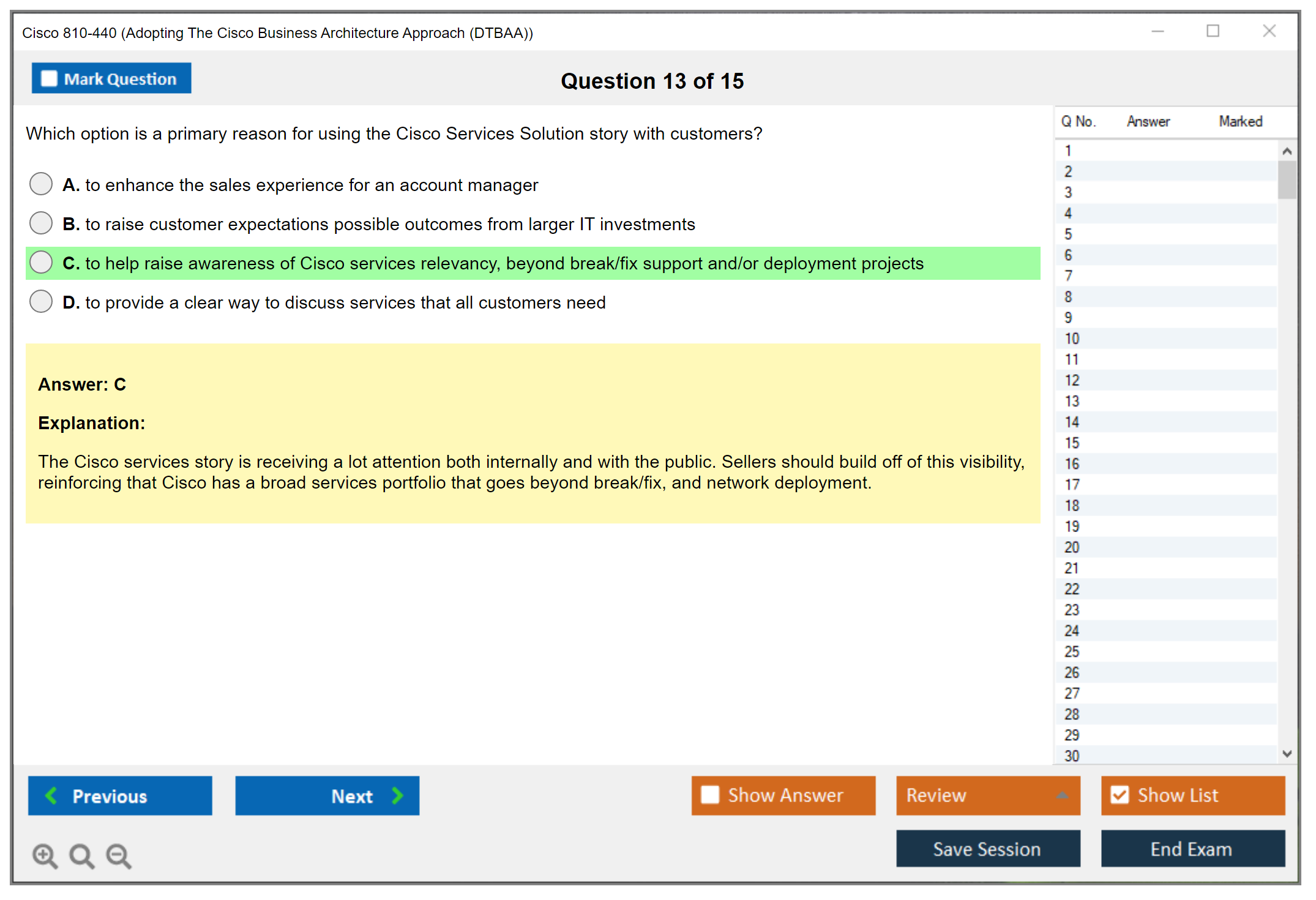 The Cisco 810-440 (Adopting The Cisco Business Architecture Approach (DTBAA)) exam is designed to test a candidate's understanding of the principles and practices involved in adopting a business architecture approach with Cisco solutions. It focuses on the alignment of business and IT strategies, business outcomes, and the development of a business architecture practice.