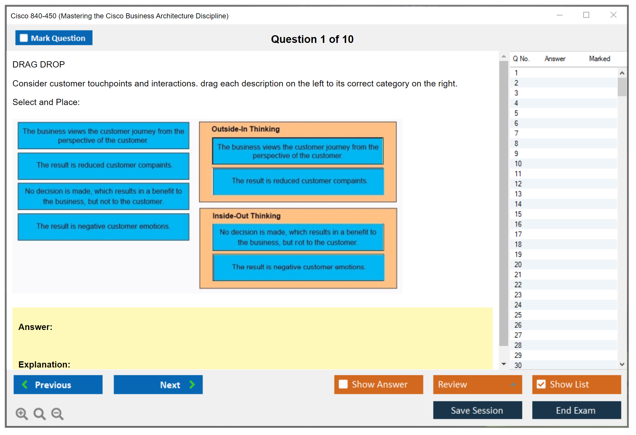 The Cisco 840-450 (Mastering the Cisco Business Architecture Discipline) exam is designed to validate a candidate's knowledge and skills in applying the Cisco Business Architecture methodology. It focuses on the ability to create and implement business strategies and solutions that align with customer needs.