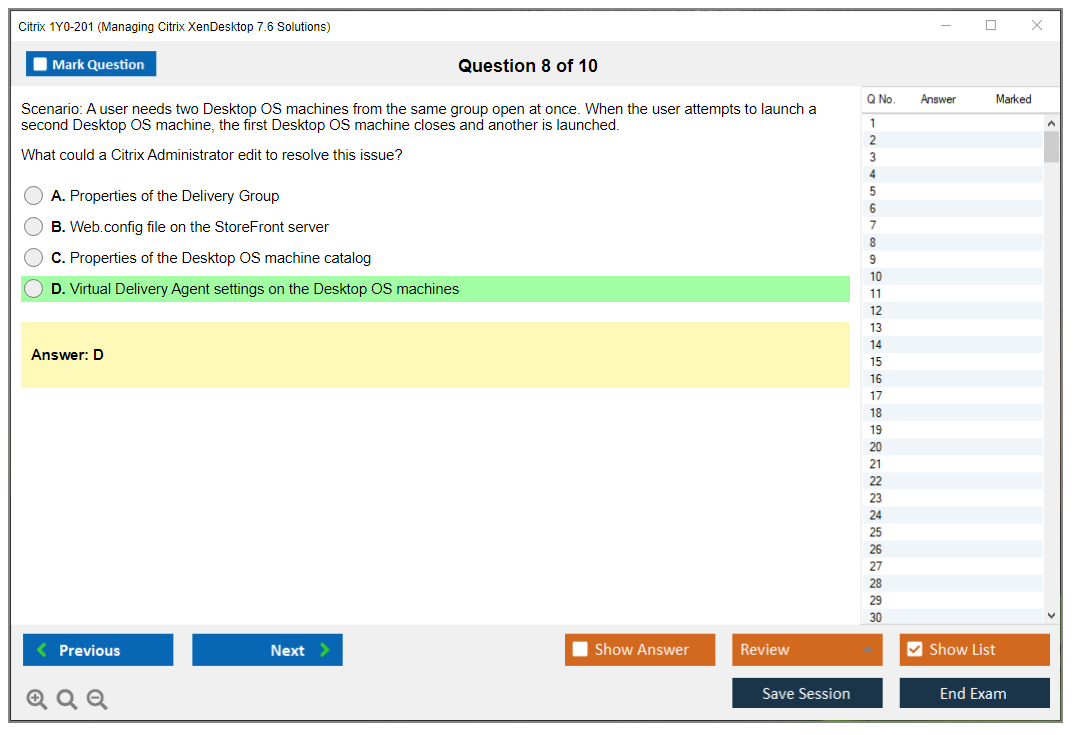 The Citrix 1Y0-201 exam is a certification test for IT professionals who manage and support Citrix XenDesktop 7.6 environments. It covers various aspects of installation, configuration, and management of the XenDesktop solutions.