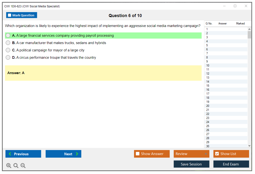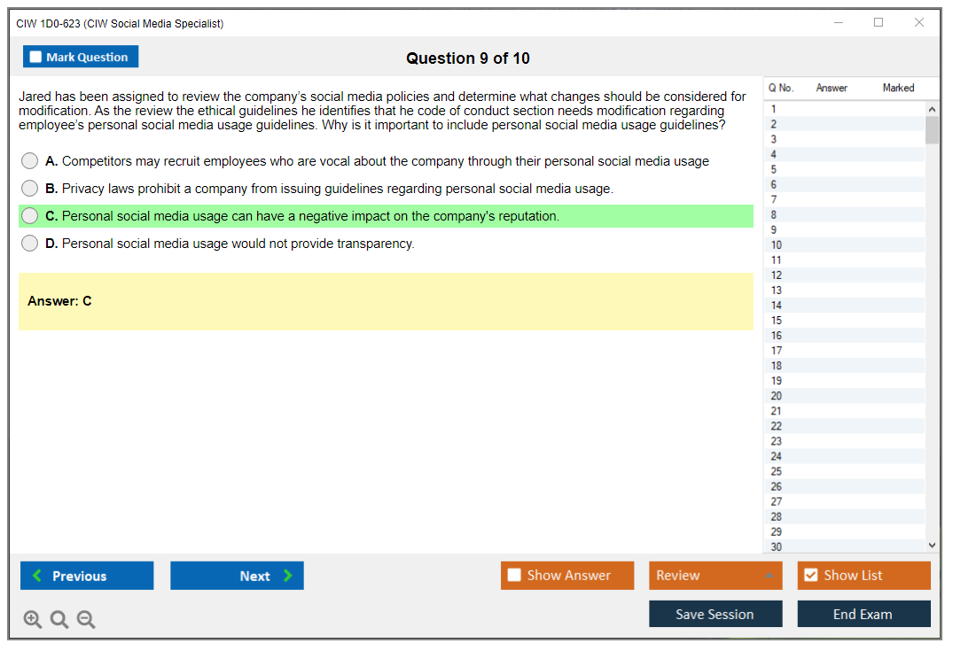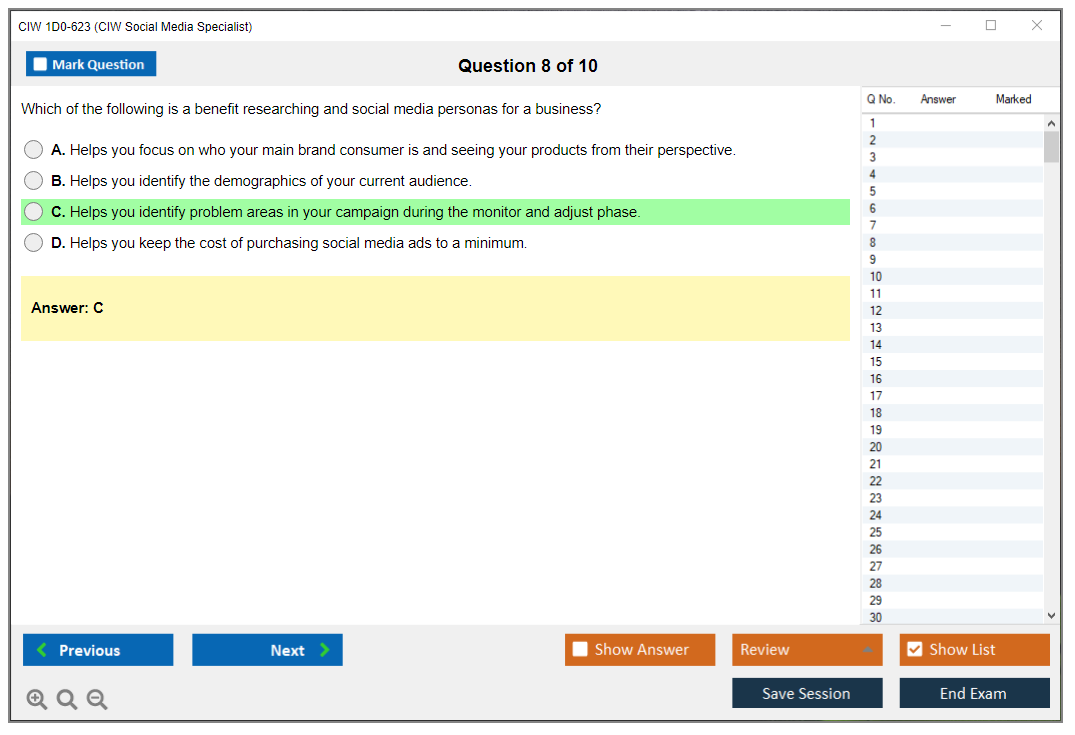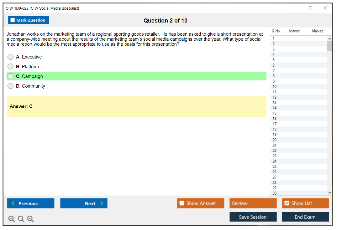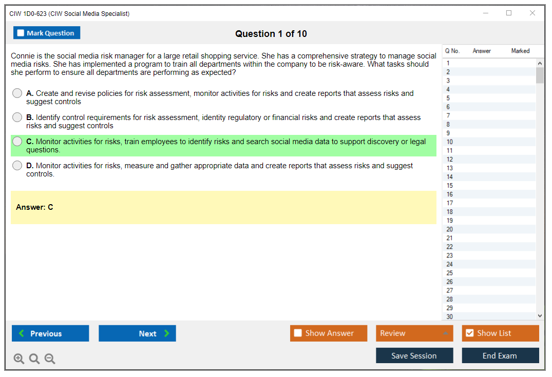 The CIW 1D0-623 (Social Media Strategist) exam is designed to test an individual's knowledge and skills in social media strategy, including the creation and management of social media campaigns, analysis of social media metrics, and understanding of social media legal issues.