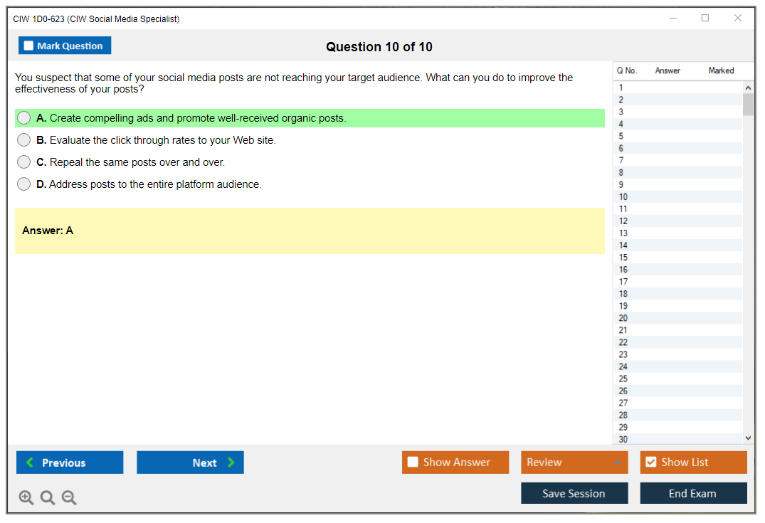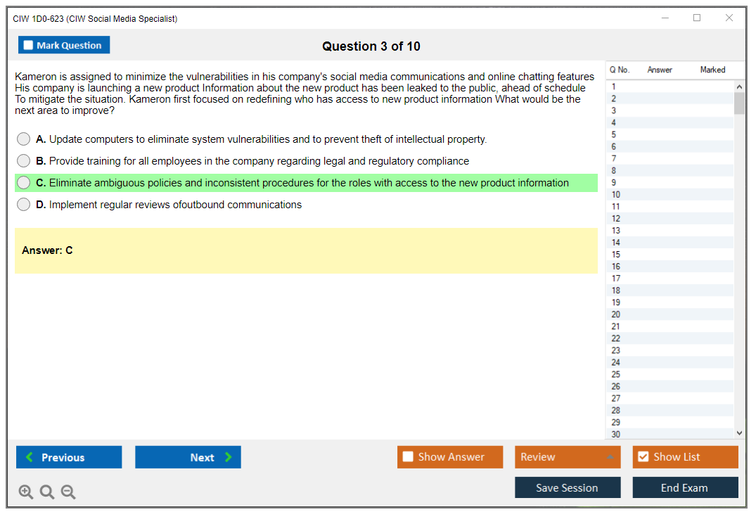 The CIW 1D0-623 Exam is a certification exam for individuals aiming to become proficient in social media strategy. It covers a variety of topics such as social media platforms, social media metrics, and the development of social media campaigns.