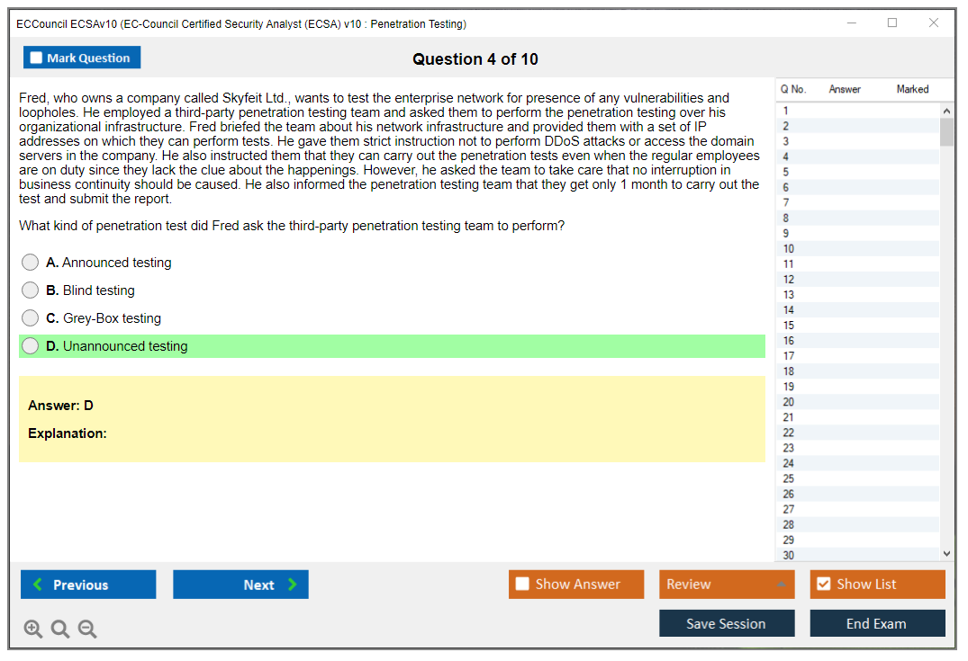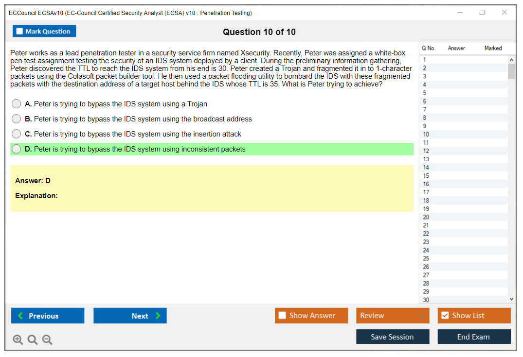 The ECCouncil ECSAv10 (EC-Council Certified Security Analyst (ECSA) v10) is a certification program that focuses on advanced security analysis and penetration testing. It is designed to validate the skills and knowledge required to perform comprehensive security assessments and penetration tests using a variety of methodologies and tools.