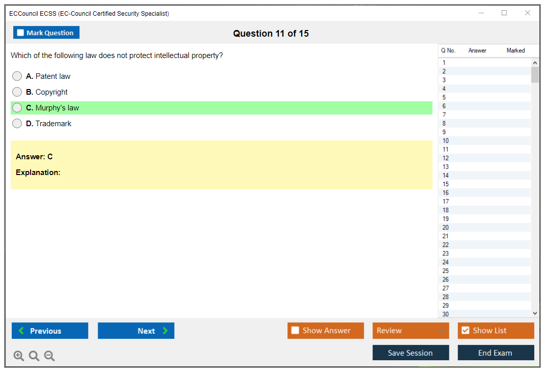 The ECCouncil ECSS (EC-Council Certified Security Specialist) Exam is a certification exam designed to validate the knowledge and skills of individuals in the field of information security, network security, and computer forensics.