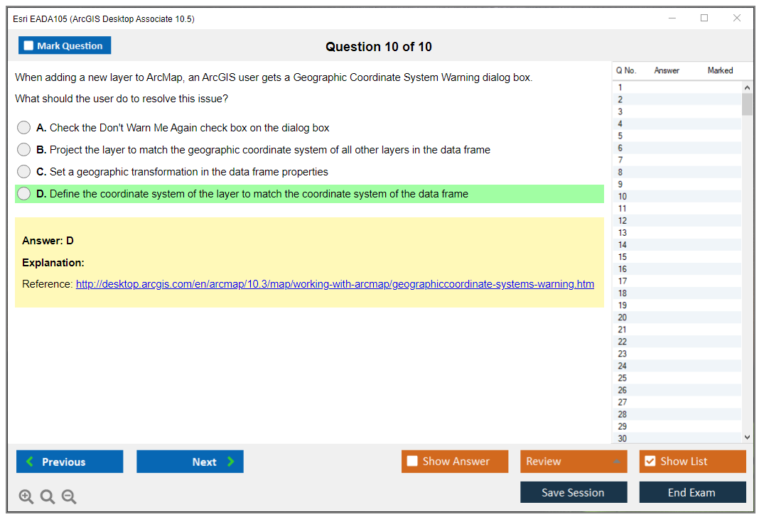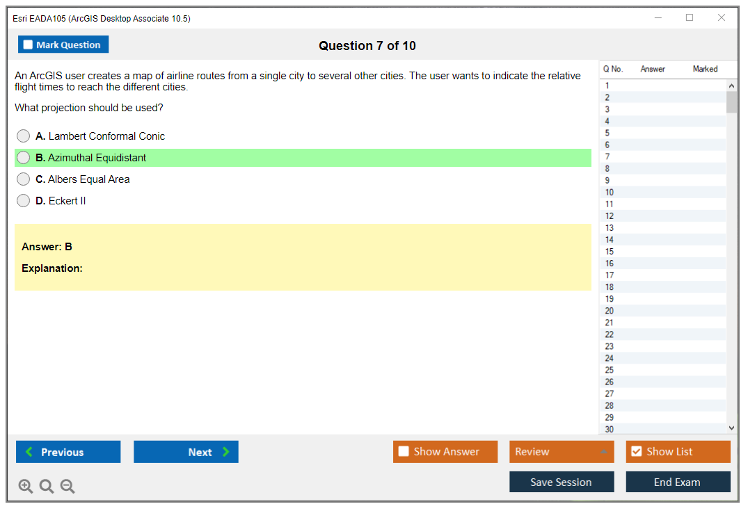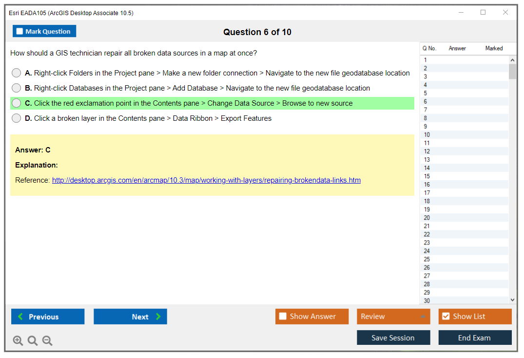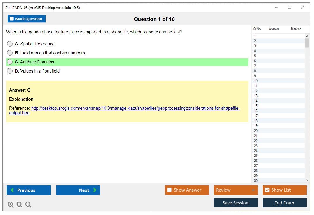 The Esri EADA105 (ArcGIS Desktop Associate 10.5) Exam is designed to test the knowledge and skills of individuals in using ArcGIS Desktop 10.5 software. It covers various aspects of GIS (Geographic Information Systems) including data management, analysis, and visualization.