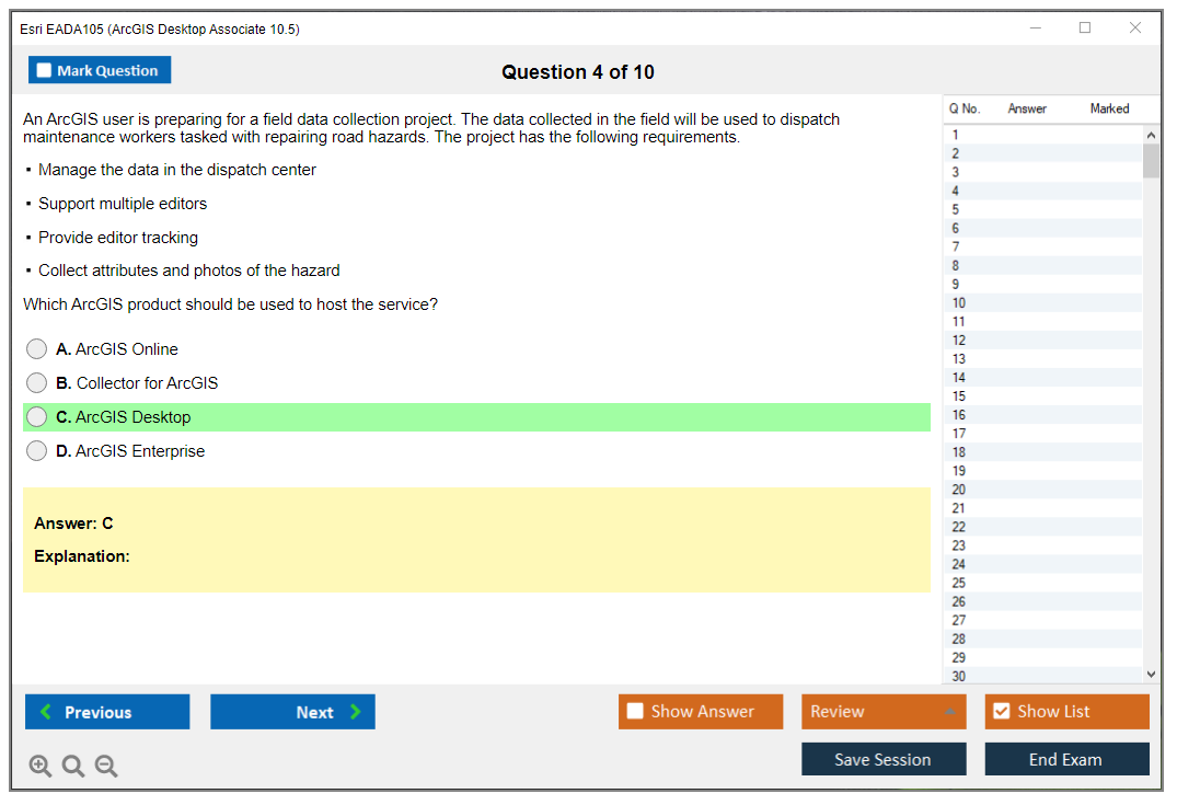 The Esri EADA105 Exam assesses the proficiency of candidates in using ArcGIS Desktop 10.5 software. It is intended for individuals who have a good understanding of GIS concepts and can perform tasks related to spatial data analysis, mapping, and GIS data management.