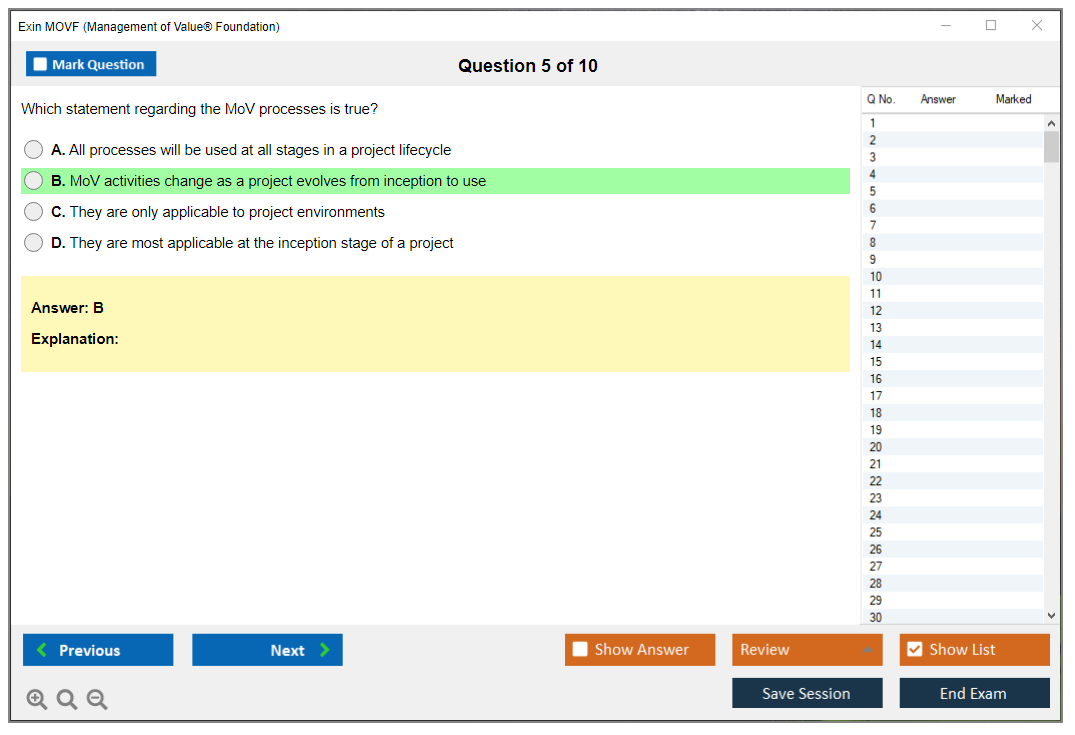 The Exin MOVF (Management of Value® Foundation) Exam is designed to provide individuals with the knowledge and skills to maximize value within an organization by implementing value management principles. It focuses on the concepts and methodologies used to enhance value in projects, portfolios, and programs.