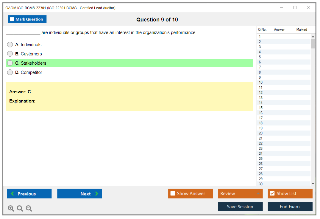The GAQM ISO-BCMS-22301 (ISO 22301 BCMS - Certified Lead Auditor) Exam is designed to assess the knowledge and skills of individuals in auditing a Business Continuity Management System (BCMS) as per the ISO 22301 standard. It validates the candidate's ability to apply the principles, procedures, and techniques of auditing and to manage an audit program.