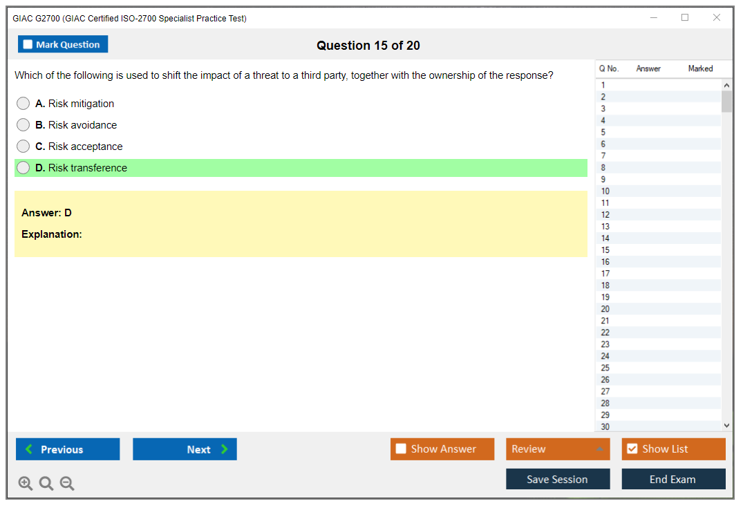 The GIAC G2700, or GIAC Certified ISO-2700 Specialist Practice Test, is an exam designed to validate the knowledge and skills required to understand and implement the ISO/IEC 27000 series of standards, which are related to information security management systems (ISMS).