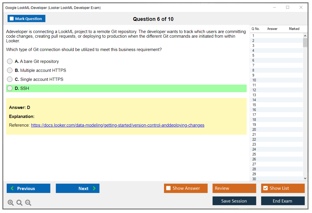 The Google LookML-Developer (Looker LookML Developer Exam) is a certification exam designed to validate a candidate's ability to develop LookML models for Looker, a business intelligence and data analytics platform. It assesses knowledge in areas such as data modeling, SQL, and LookML syntax.