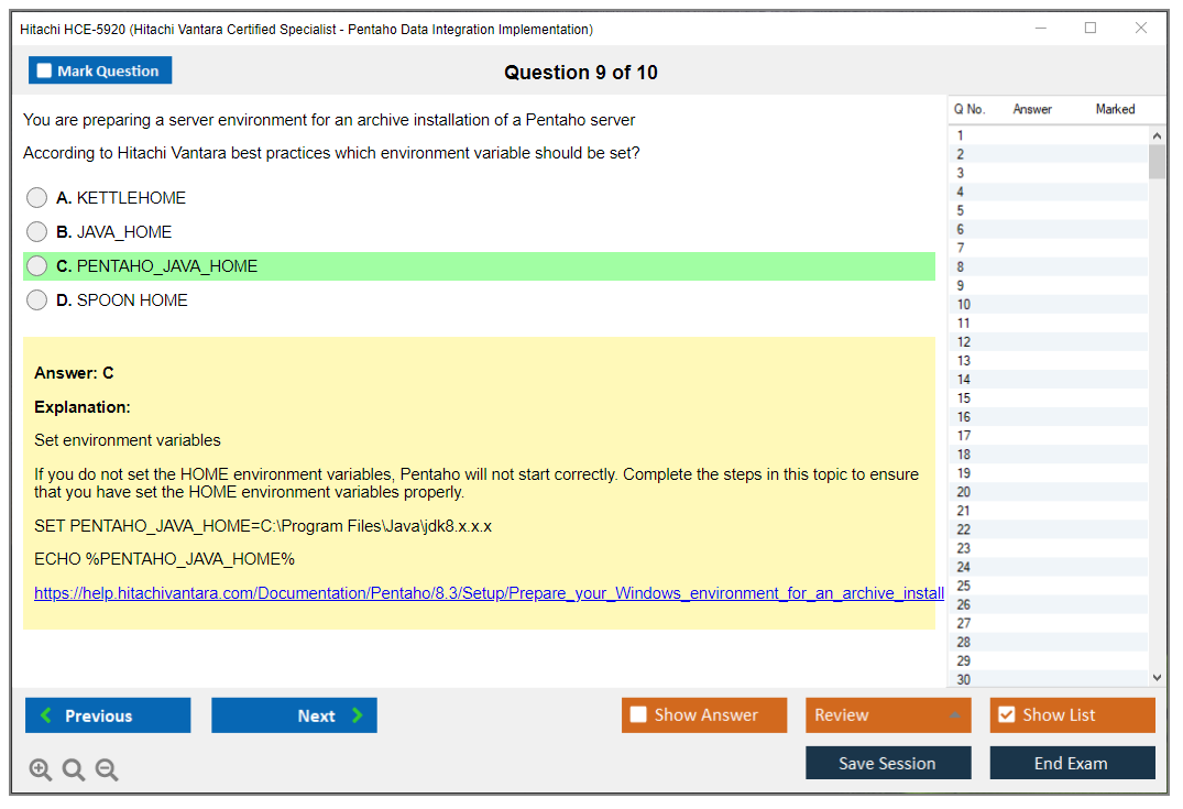The Hitachi HCE-5920 exam is designed for individuals aiming to become certified specialists in Pentaho Data Integration (PDI) implementation. This certification validates the candidate's skills and knowledge in implementing, configuring, and managing PDI solutions.
