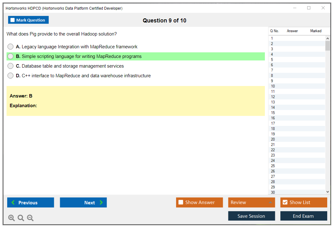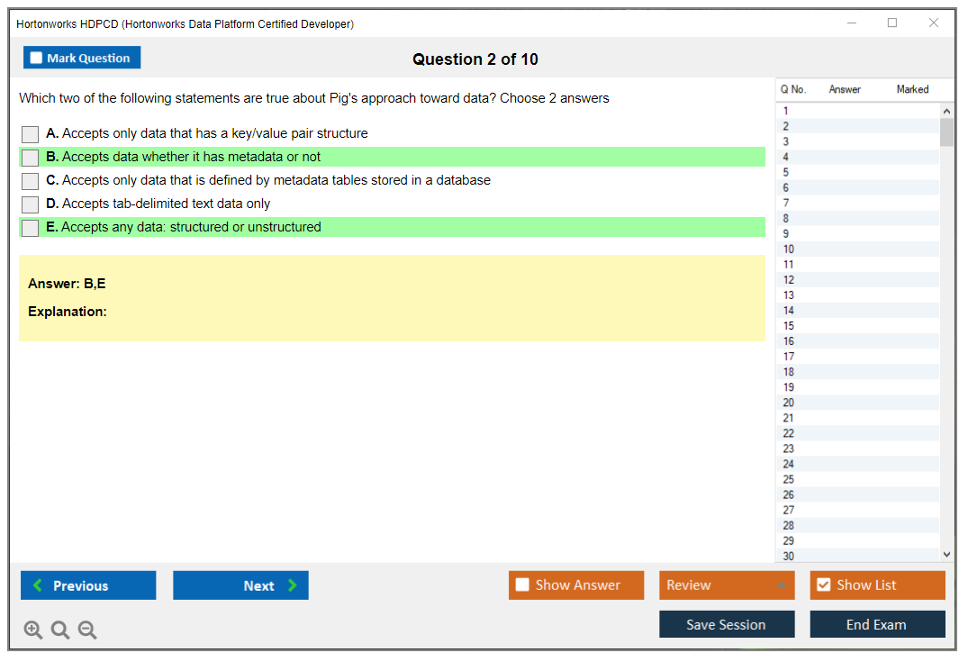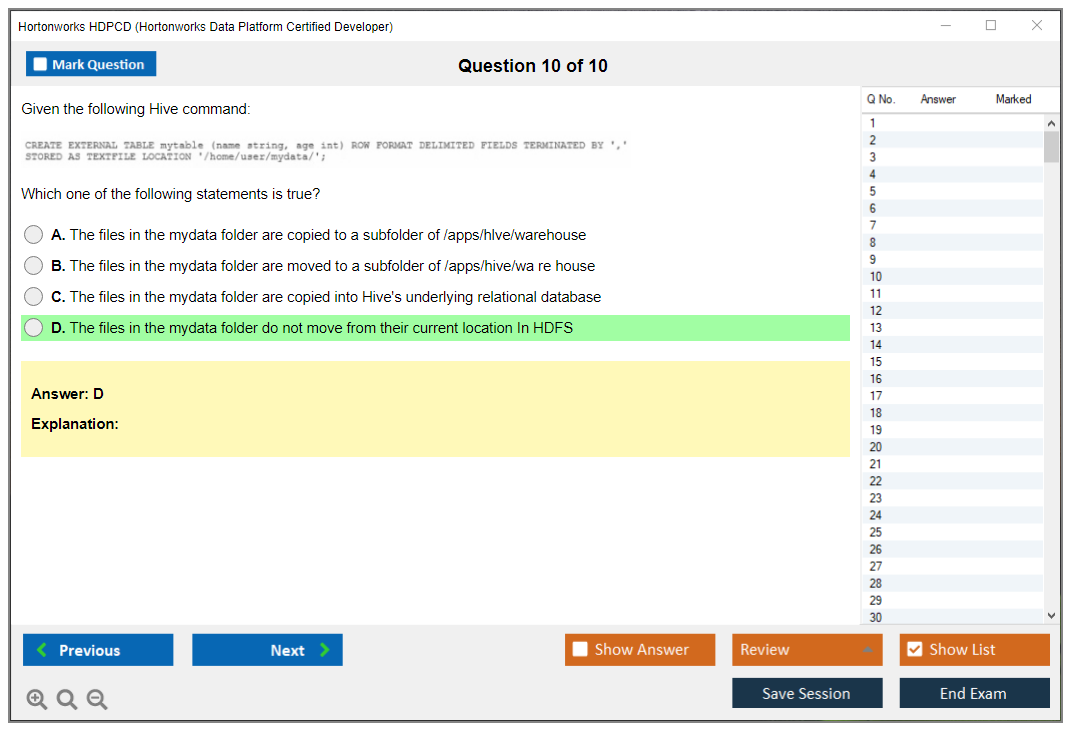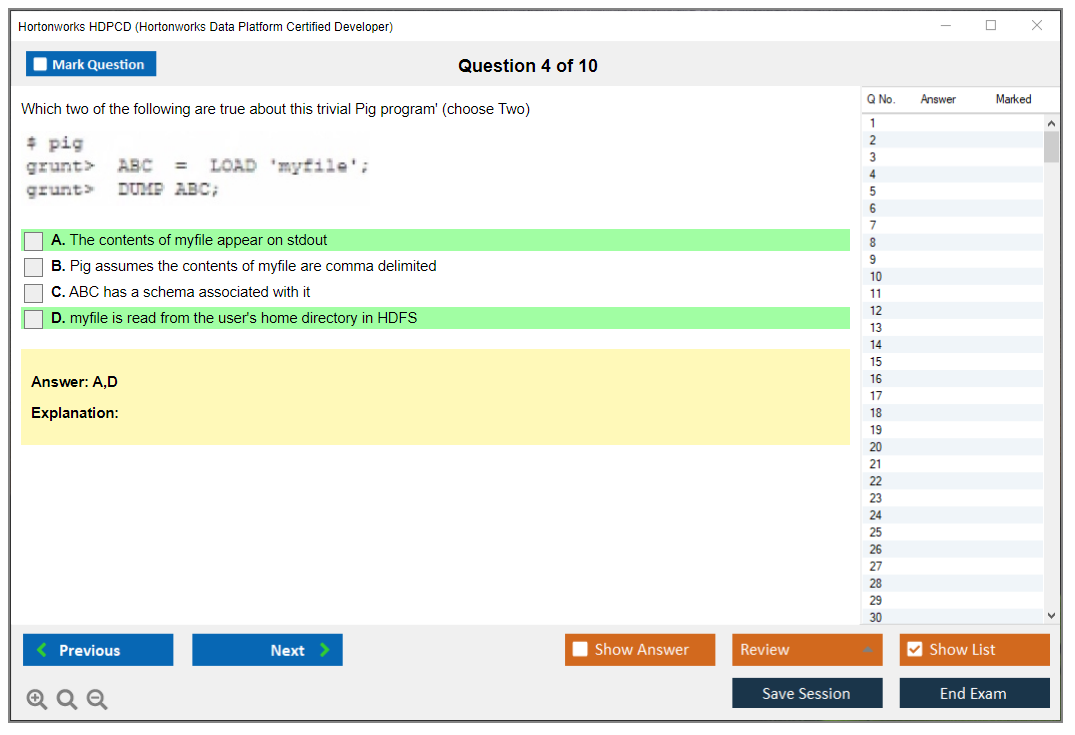 The Hortonworks HDPCD (Hortonworks Data Platform Certified Developer) Exam is a certification exam designed to validate the skills and knowledge of developers working with the Hortonworks Data Platform (HDP). The exam focuses on the ability to develop and implement applications on the HDP using various tools and technologies.