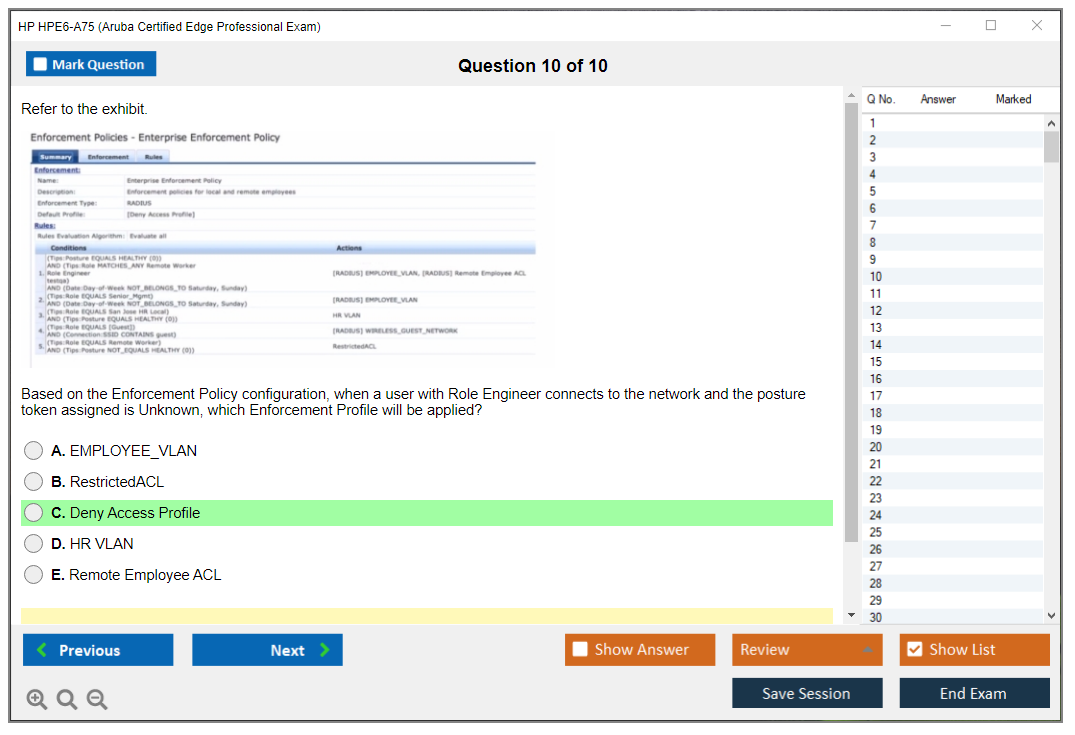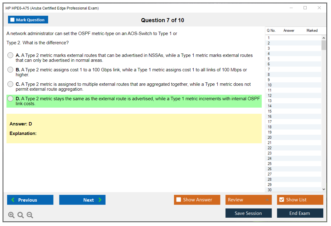 The difficulty level of the HP HPE6-A75 Exam is considered to be advanced. It is designed for experienced professionals with a deep understanding of Aruba network solutions.