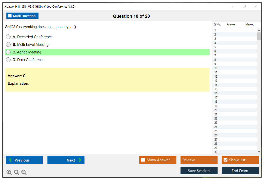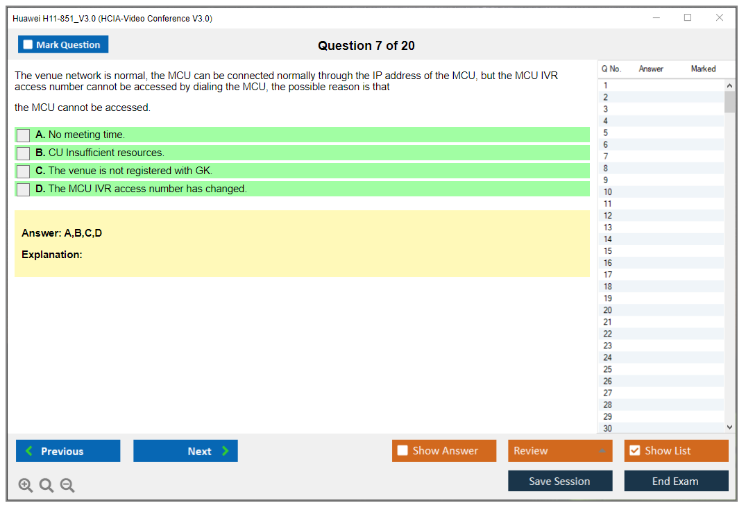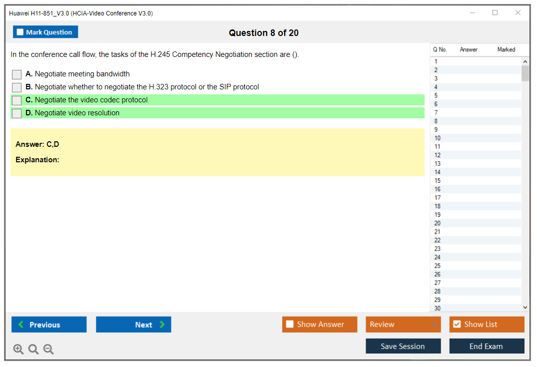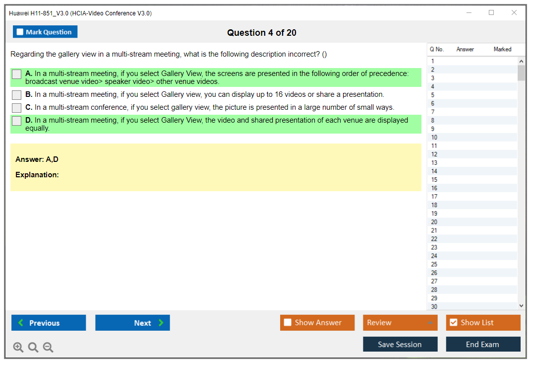 The Huawei H11-851_V3.0 (HCIA-Video Conference V3.0) Exam is designed to validate the knowledge and skills of professionals in the field of video conferencing. It covers various aspects of video conferencing technologies, including system installation, configuration, management, and troubleshooting.