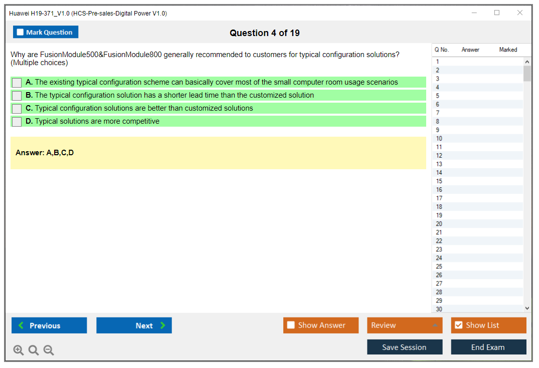 The Huawei H19-371_V1.0 (HCS-Pre-sales-Digital Power V1.0) exam is designed for professionals who are involved in the pre-sales activities related to Huawei's digital power solutions. This certification validates the candidate's knowledge and skills in understanding and promoting Huawei's digital power products and solutions.
