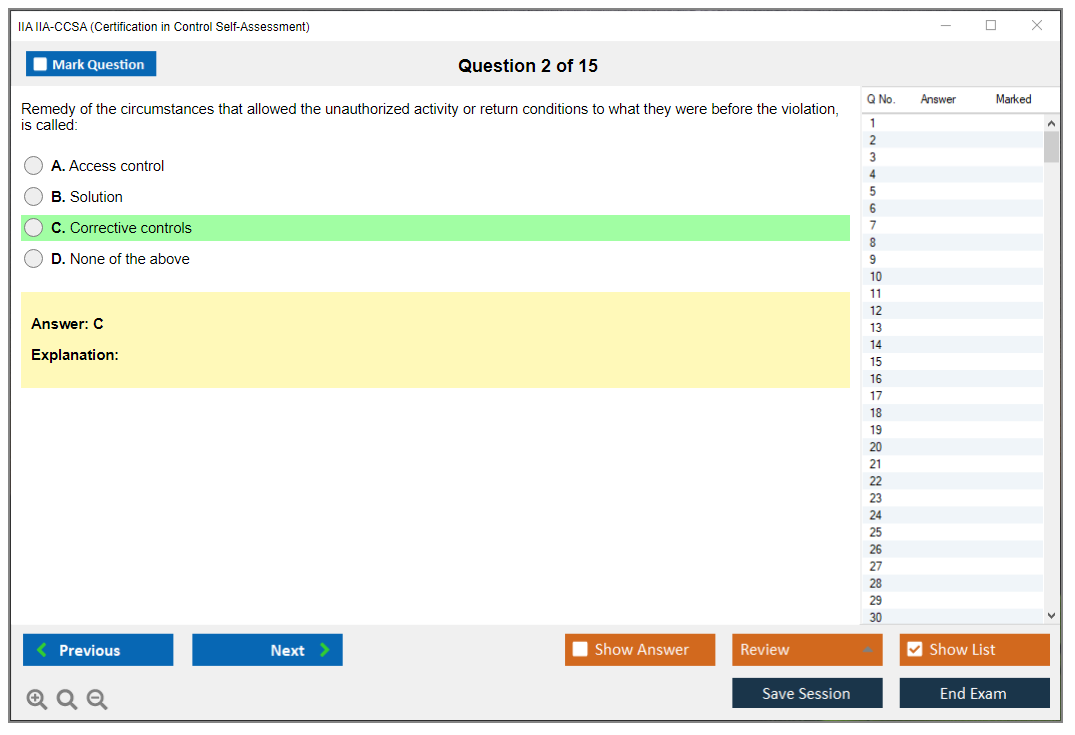 The IIA IIA-CCSA (Certification in Control Self-Assessment® (CCSA®)) exam is designed to test the knowledge and skills of professionals in the field of control self-assessment. It validates the ability to identify risks, assess control processes, and recommend improvements.