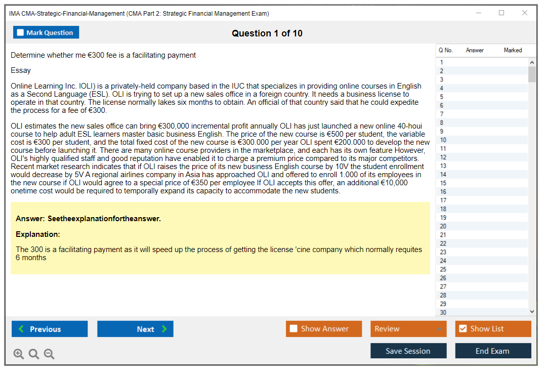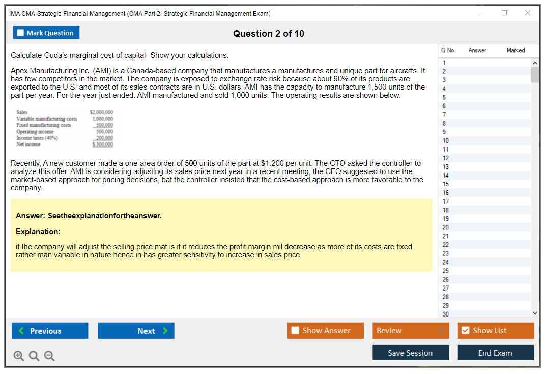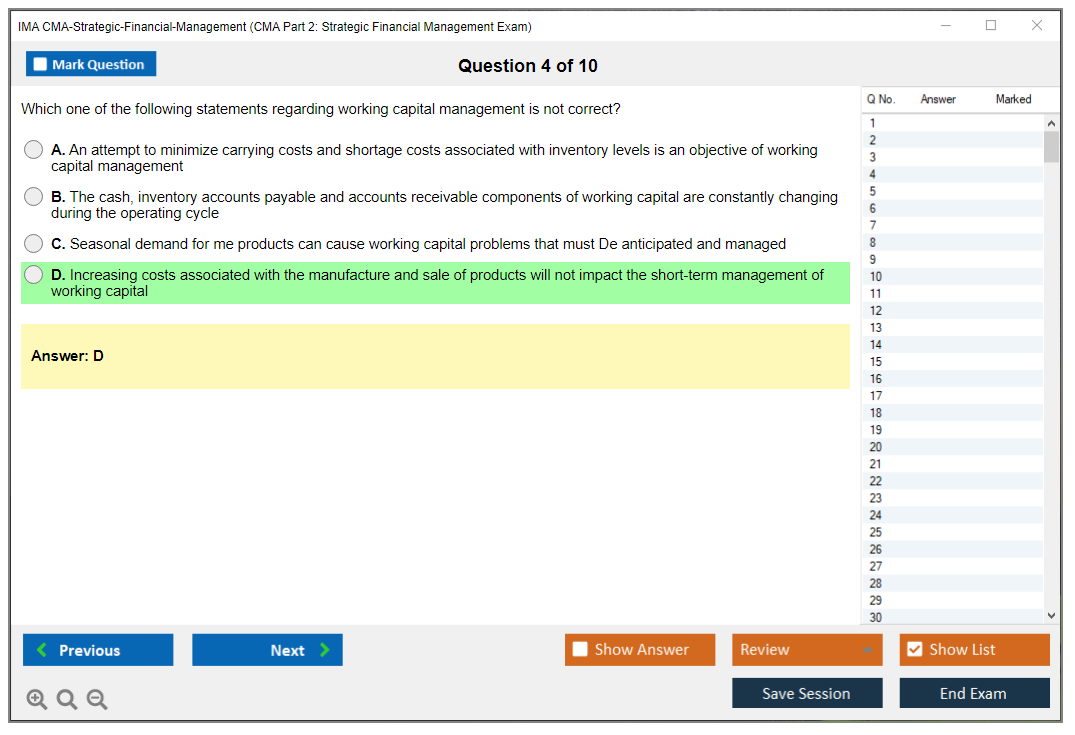 The IMA CMA-Strategic-Financial-Management (CMA Part 2: Strategic Financial Management Exam) is designed to assess the knowledge and skills of financial professionals in areas such as financial statement analysis, corporate finance, decision analysis, risk management, investment decisions, and professional ethics.