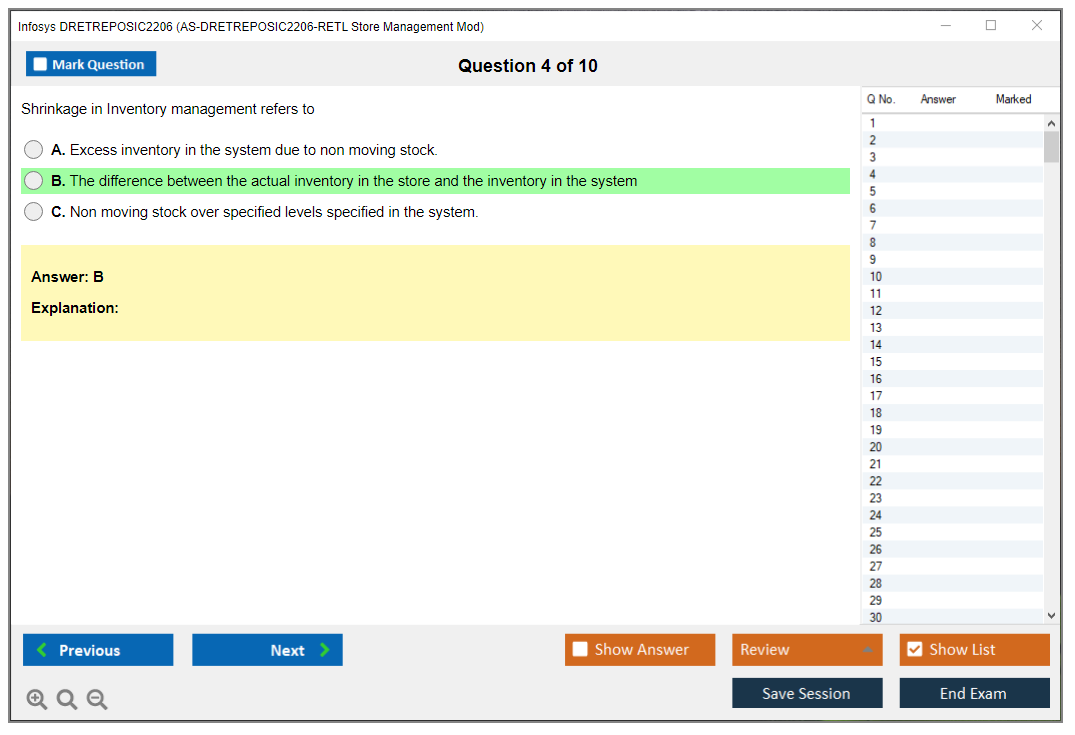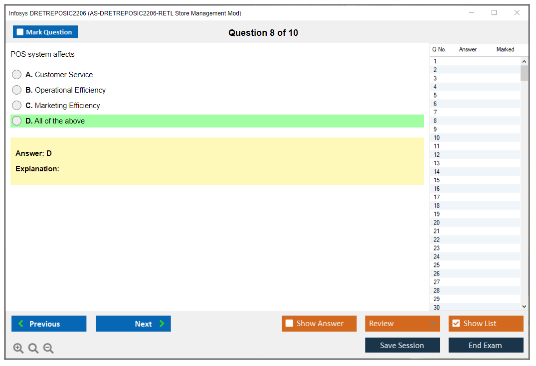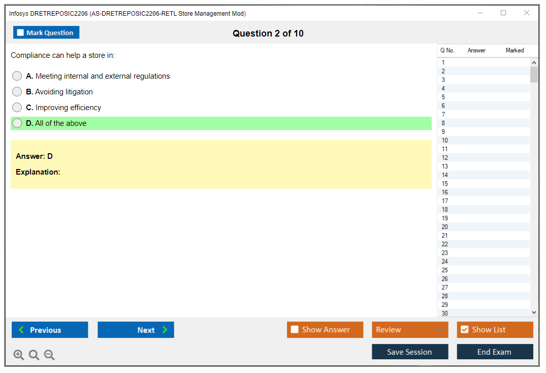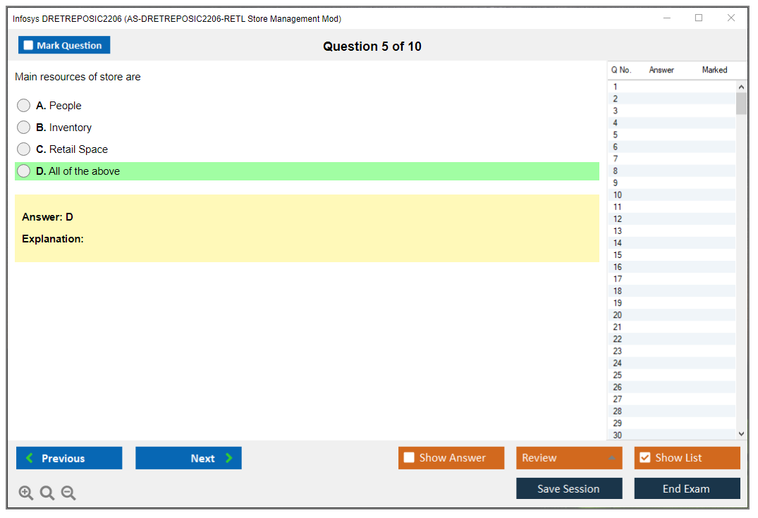 The Infosys DRETREPOSIC2206 (AS-DRETREPOSIC2206-RETL Store Management Mod) Exam is designed to evaluate the knowledge and skills of professionals in store management within retail environments. It covers various aspects of store operations, inventory management, customer service, and retail technologies.