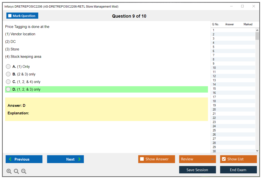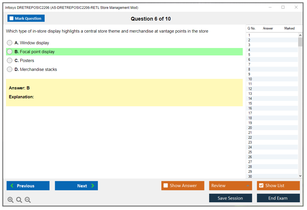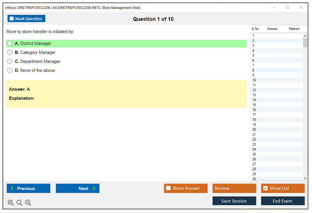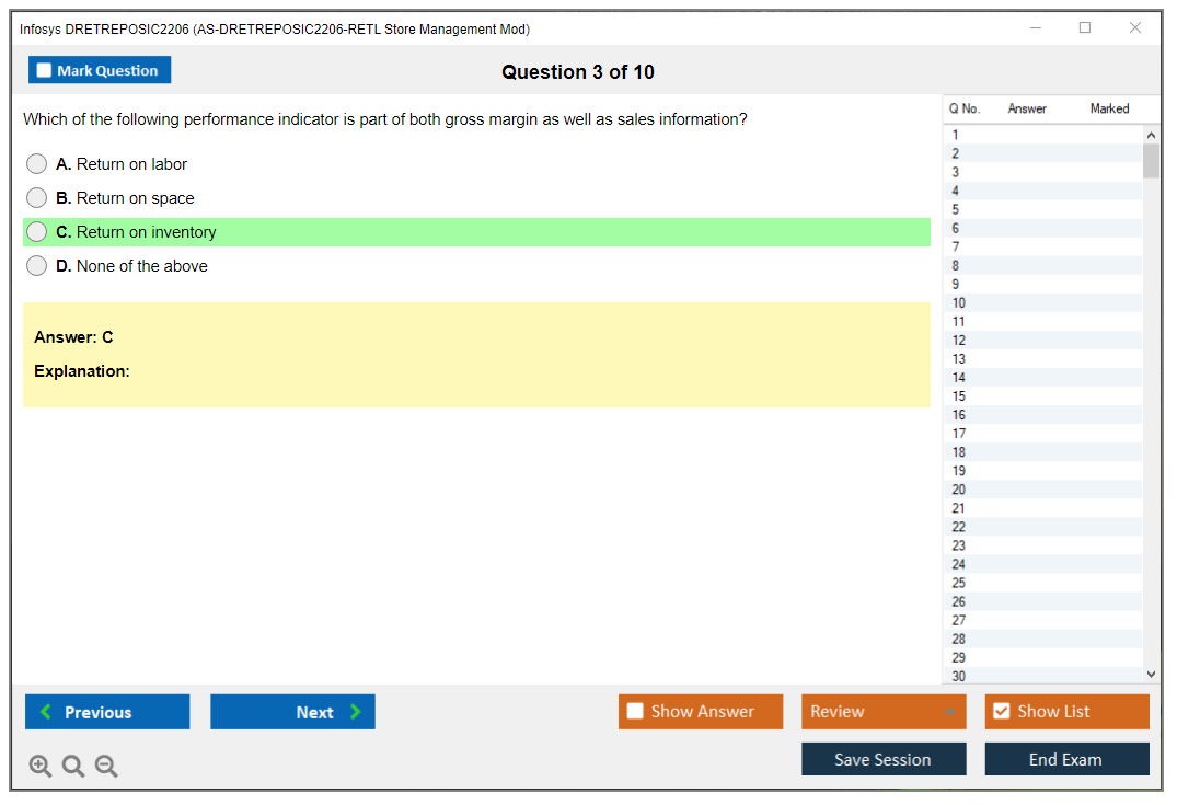 The Infosys DRETREPOSIC2206 (AS-DRETREPOSIC2206-RETL Store Management Mod) Exam is designed to evaluate the knowledge and skills of professionals in store management within retail environments. It covers various aspects of store operations, inventory management, customer service, and retail technologies.