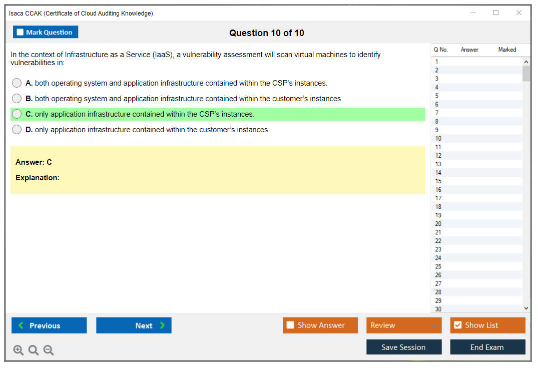 The ISACA CCAK exam is a specialized certification that focuses on cloud auditing. It covers a range of topics including cloud governance, risk management, compliance, and security. The exam is intended for professionals who are responsible for auditing cloud systems and ensures they have the knowledge to address the complexities and risks associated with cloud environments.