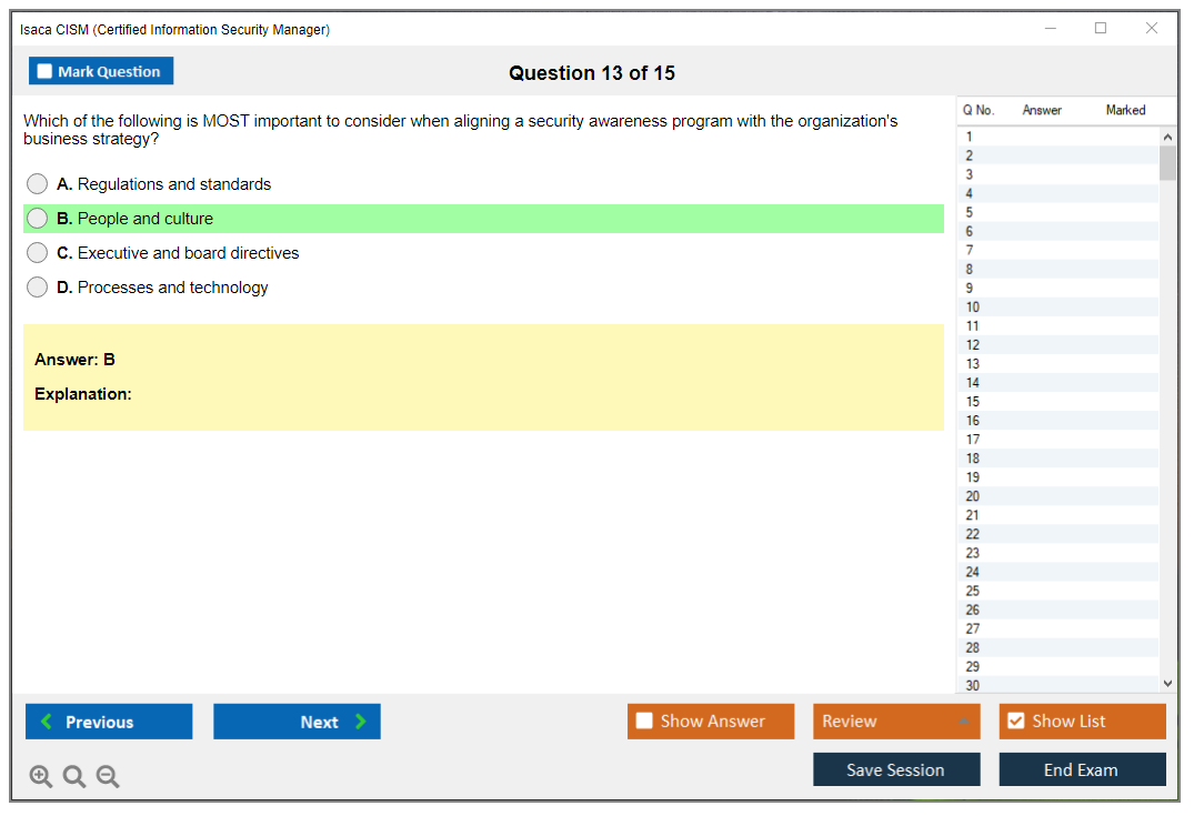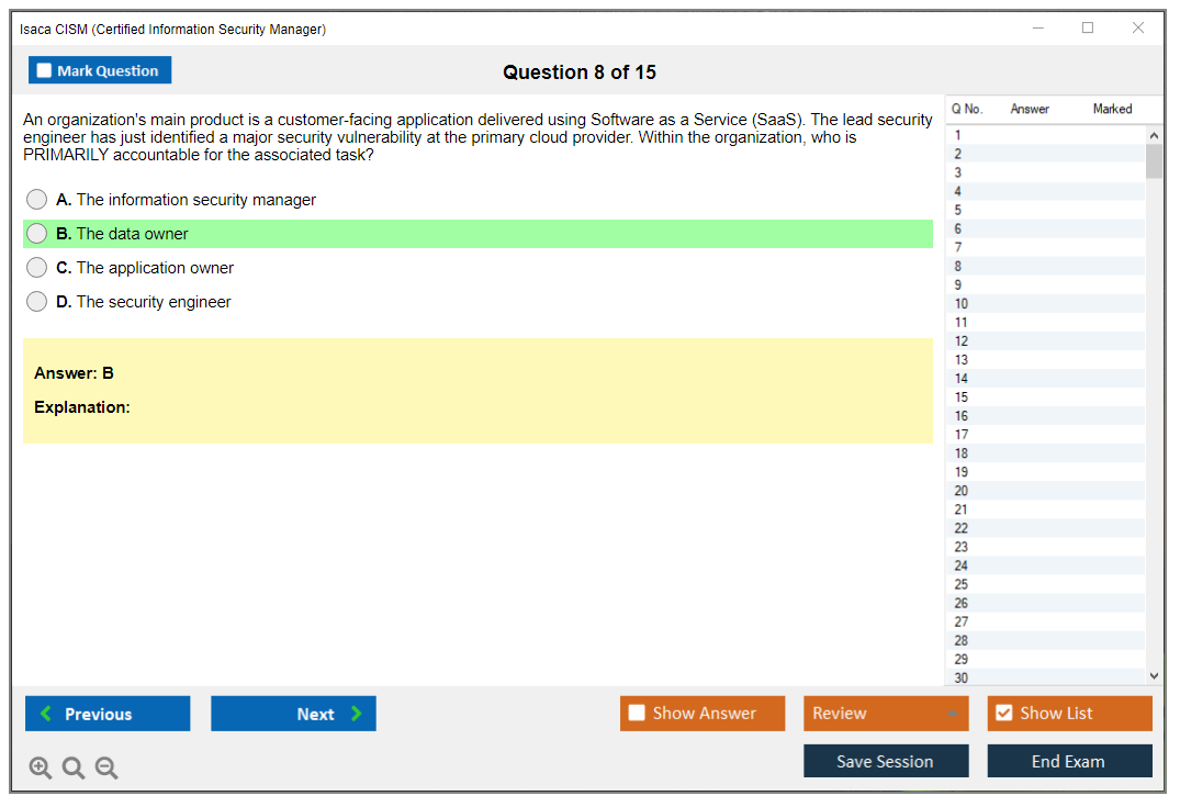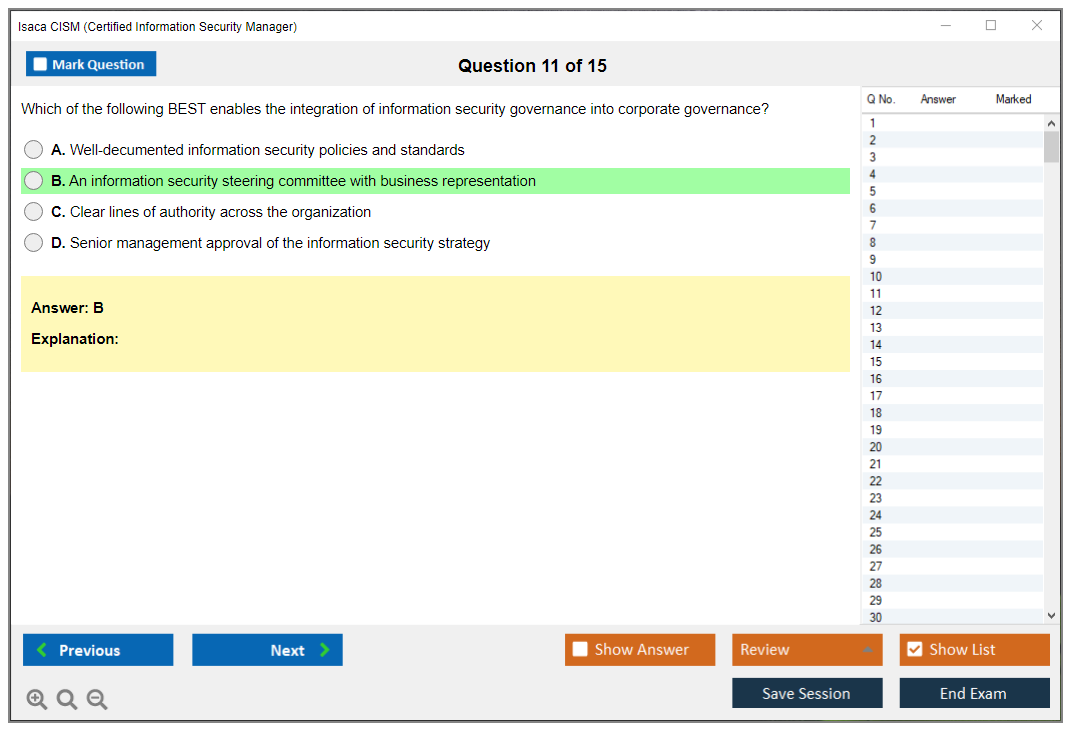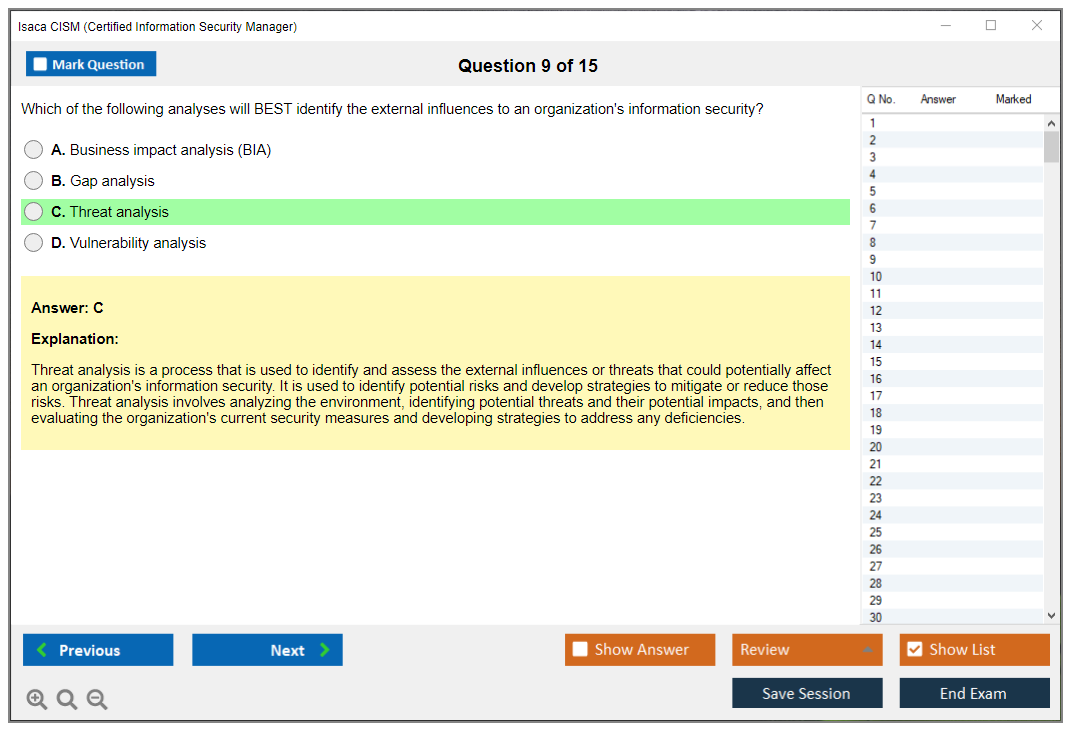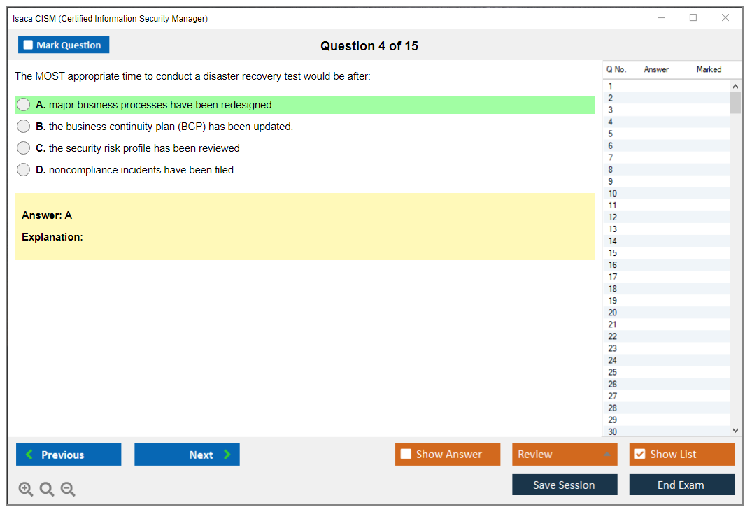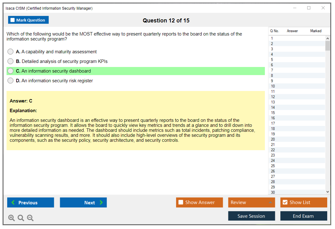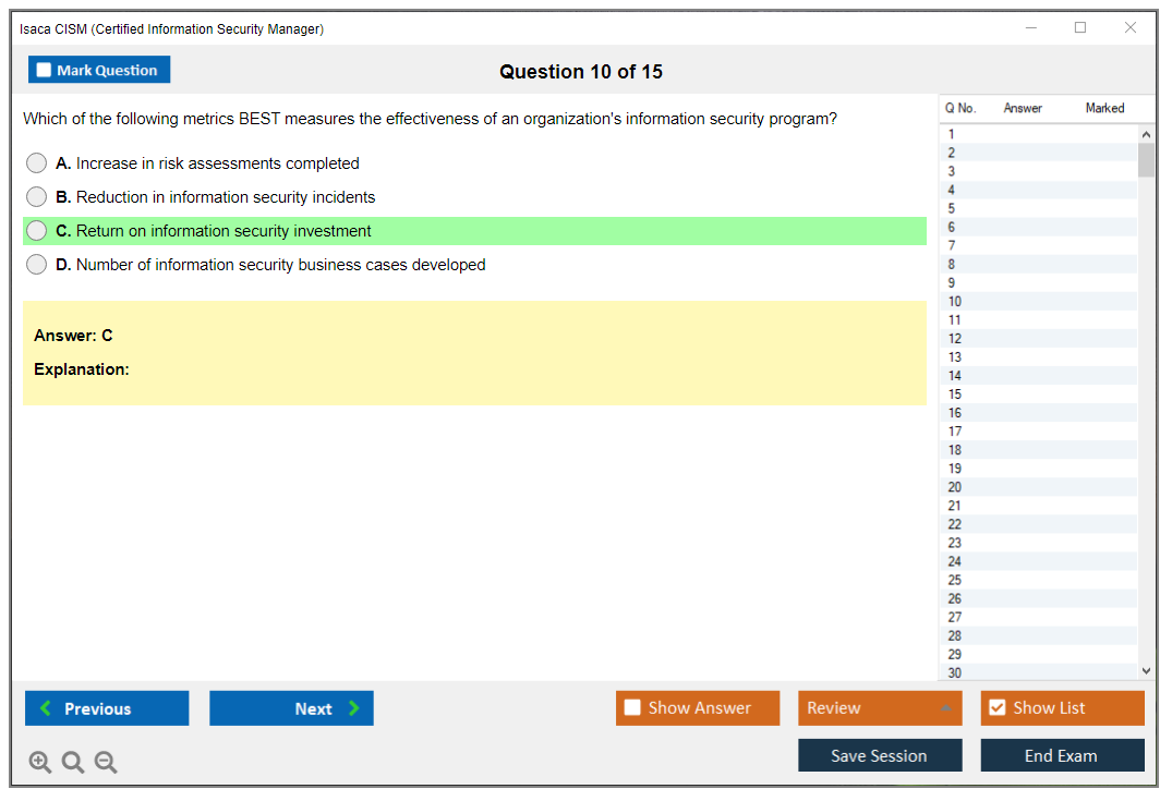 The ISACA Certified Information Security Manager (CISM) exam is a globally recognized certification designed for individuals who manage, design, oversee, and assess an enterprise’s information security. It focuses on the development and management of information security programs and the assessment of risk and incident management.