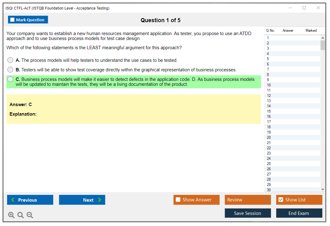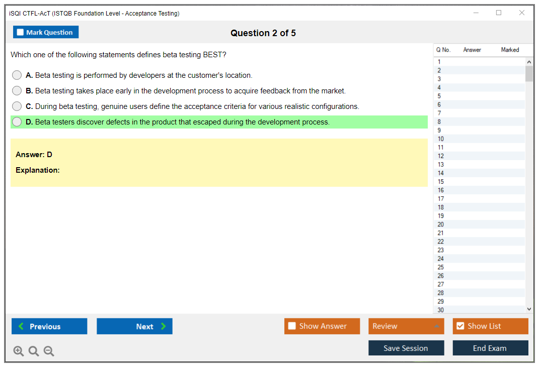 The iSQI CTFL-AcT (ISTQB Foundation Level - Acceptance Testing) exam is designed to certify individuals in the principles and practices of acceptance testing. This certification is part of the ISTQB Certified Tester scheme and focuses on the knowledge required to perform acceptance testing effectively.