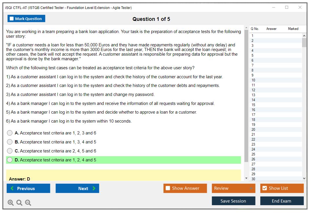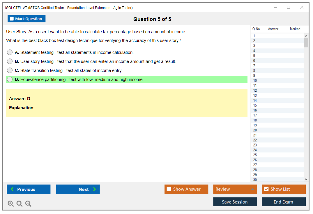 The difficulty level of the iSQI CTFL-AT Exam is considered to be moderate. It requires a good understanding of agile principles and testing practices, but it is designed to be accessible to individuals with foundational knowledge and experience in agile environments.