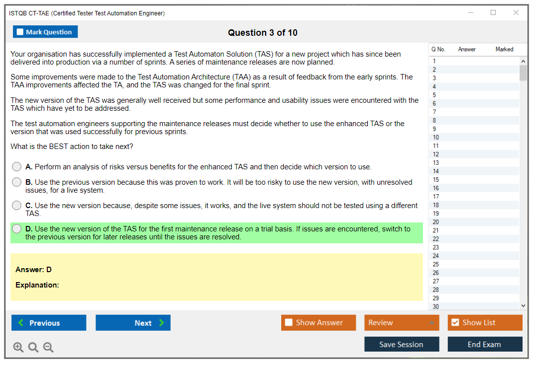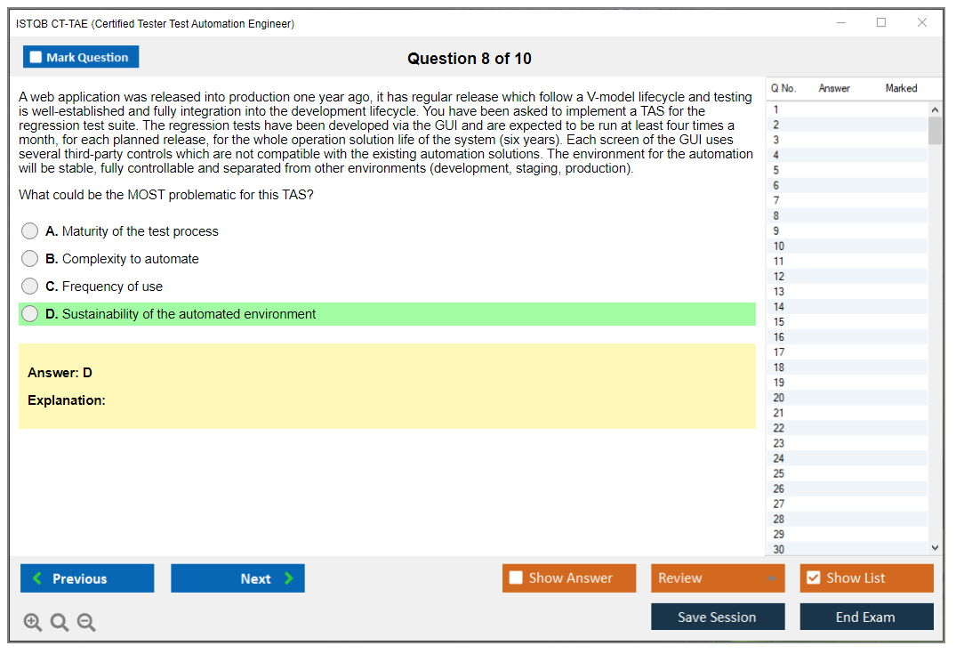 The difficulty level of the ISTQB CT-TAE Exam is considered advanced. It requires a deep understanding of test automation concepts and practical experience in the field.