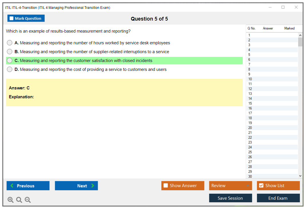 The passing score for the ITIL 4 Managing Professional Transition Exam is 70%, which means you need to get at least 28 out of 40 questions correct.