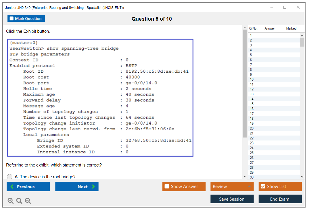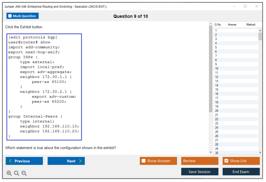 The Juniper JN0-349 (Enterprise Routing and Switching - Specialist (JNCIS-ENT)) exam is designed for networking professionals with intermediate knowledge of routing and switching implementations in Junos. The exam verifies a candidate's understanding of advanced routing technologies and related platform configuration and troubleshooting skills.