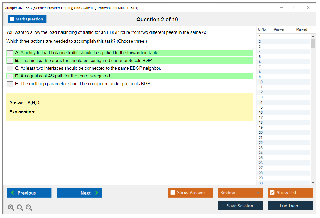 The Juniper JN0-663 exam is a professional-level certification exam that tests the candidate's expertise in advanced routing technologies and related platform configuration and troubleshooting skills. It is part of the Juniper Networks Certification Program (JNCP) and focuses on the Junos OS used in service provider environments.