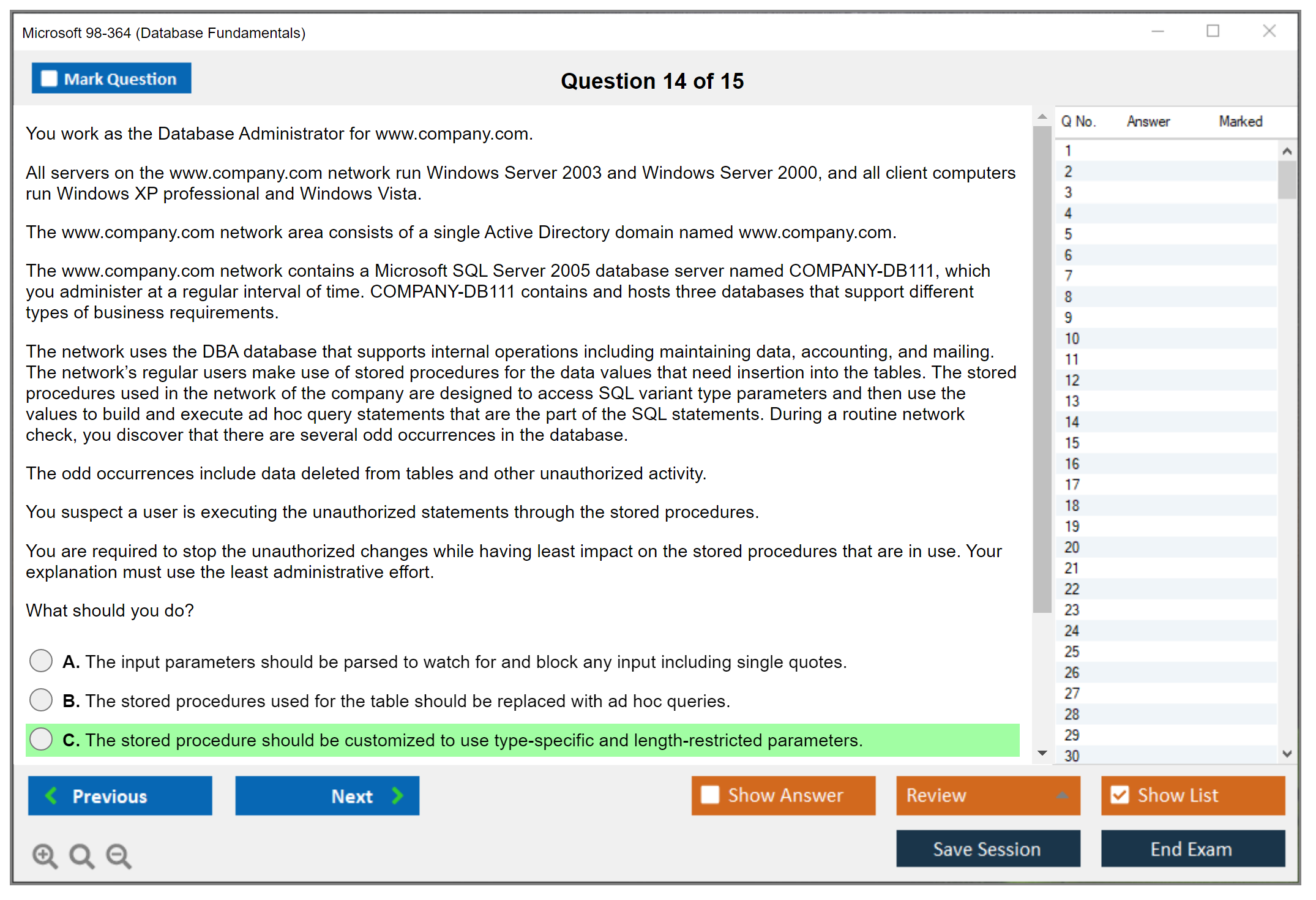 The question format of the Microsoft 98-364 Exam includes multiple-choice, drag-and-drop, and case study questions.