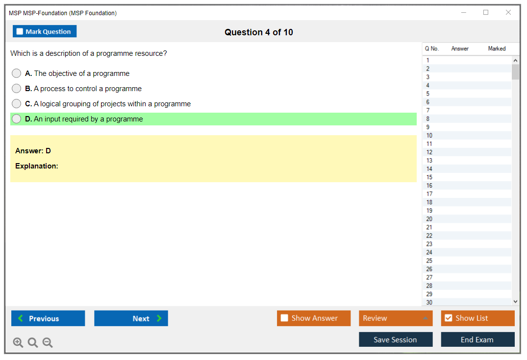 The MSP Foundation Exam is an entry-level certification exam that assesses an individual's knowledge of the MSP framework. It is suitable for those who are new to program management or those who are working in a program support role and want to demonstrate their understanding of the MSP methodology.