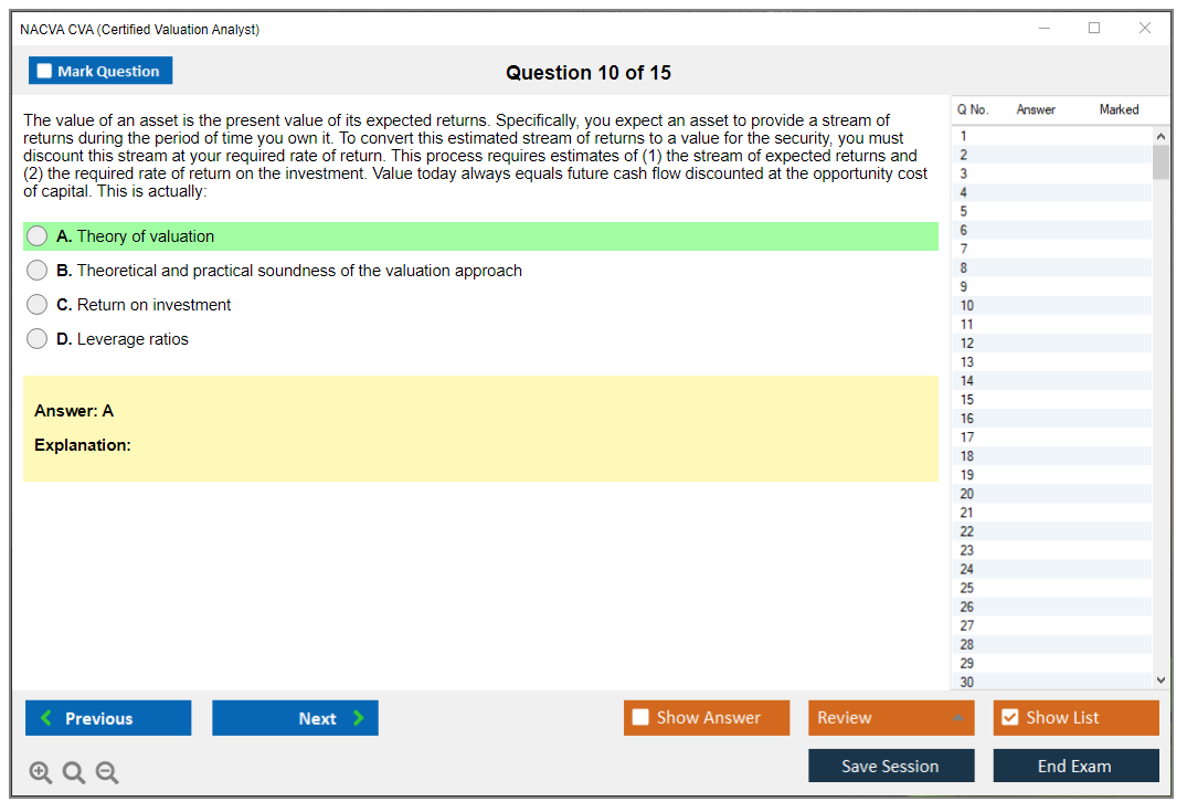 The NACVA CVA (Certified Valuation Analyst) Exam is a professional certification exam designed to assess the knowledge and skills of valuation professionals. It is administered by the National Association of Certified Valuators and Analysts (NACVA).